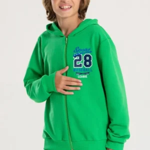 Conjunto moleton 50% algodón y 50% poliéster. Abrigo verde con cremallera, capucha y estampado frontal, pantalón también en verde con rayas laterales!