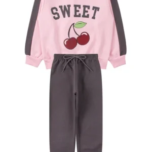 Conjunto moleton 64% poliéster y 36% algodón. Chaqueta rosa con estampado de corazones giratorios, cremallera frontal y capucha. Pantalón del mismo color y estampado con cordones decorativos.