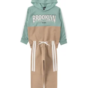 Conjunto de felpa verde Brooklyn Ibiza para niño, compuesto por dos piezas. Moleton de felpa (75 % algodón, 25 % poliéster), cuello redondo con capucha, estampado frontal, abertura frontal con aplique en color de contraste (75 % algodón, 25 % poliéster), mangas con detalles de trenzado lateral en color de contraste, puños y bajo de canalé con aplique en color de contraste. Pantalón de felpa (75 % algodón, 25 % poliéster), cinturilla elástica y cordón decorativo frontal, aberturas frontales con detalles de trenzado en color de contraste y puños de canalé.