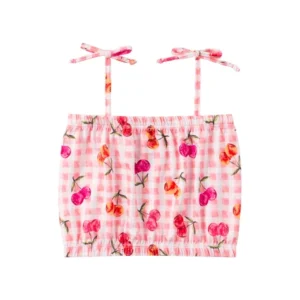 Conjunto de sudadera de cereza rosa para niña, compuesto por dos piezas. Blusa sin tirantes de suplex sublimado (96 % poliéster, 4 % elastano), tirantes con cierre de lazo, cuello y bajo elásticos. Falda corta de sudadera (75 % algodón, 25 % poliéster), cinturilla elástica y aplique frontal de cordón decorativo, solapa frontal.