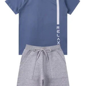 Conjunto azul de sudadera medio relajado para niño , compuesto por dos piezas. Camiseta de punto medio (100 % algodón), cuello redondo y estampado frontal. Bermudas de sudadera (75 % algodón, 25 % poliéster), cinturilla elástica acanalada y cordón decorativo frontal, bolsillos frontales funcionales.