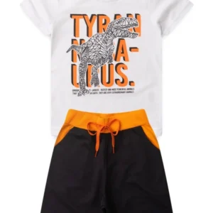 Conjunto para hombre súper mono en jersey y sudadera. Camiseta blanca con estampado frontal y pantalón corto negro con cinturilla acanalada naranja y cordones decorativos.