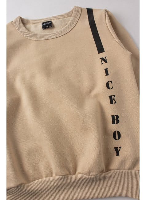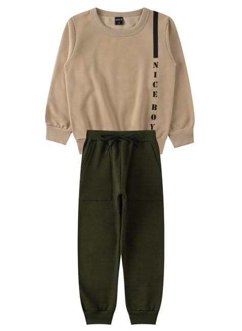 Conjunto para niño Nice Boy compuesto por dos piezas. Buzo confeccionada en tejido de moleton afelpado (75% algodón 25% poliéster), cuello redondo con capucha, estampado frontal, puños acanalados, bajo acanalado con aplique frontal de etiqueta de clip personalizada. Pantalón confeccionado en tejido de moleton afelpado (75% algodón 25% poliéster), cinturilla elástica con aplicación de cordón decorativo en la parte delantera, puños de canalé.