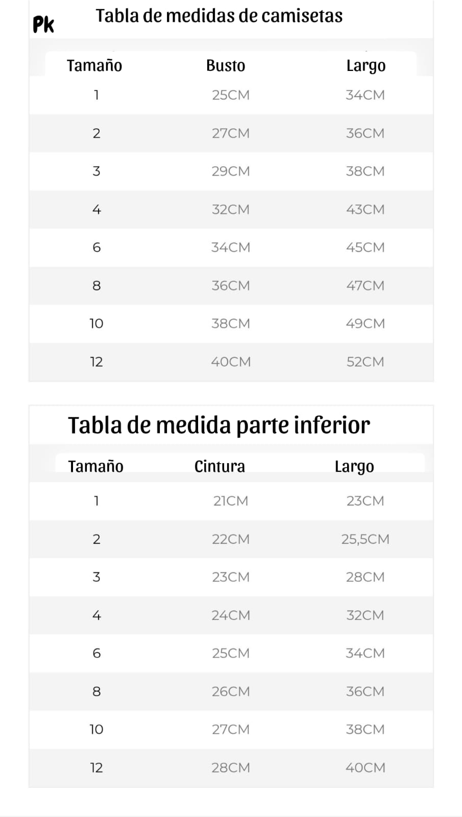 | Talle | 1, 2, 3, 4, 8, 10, 12 |