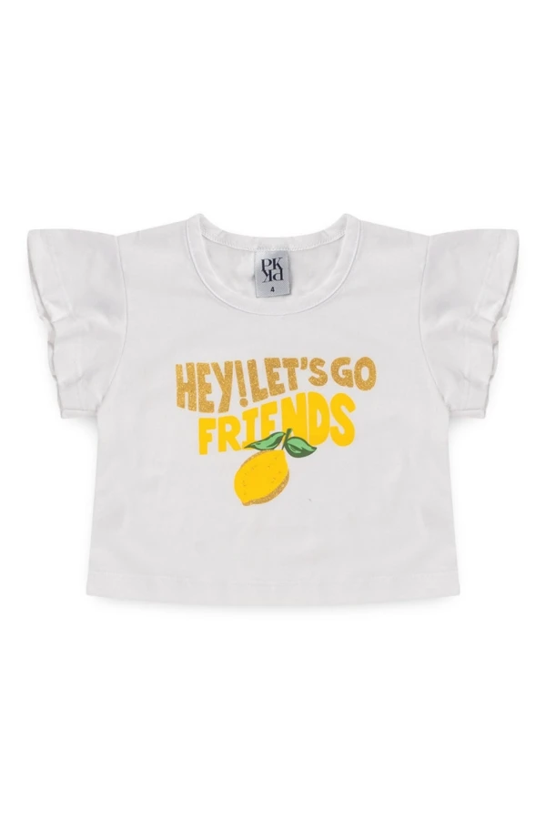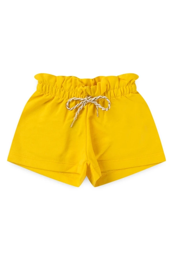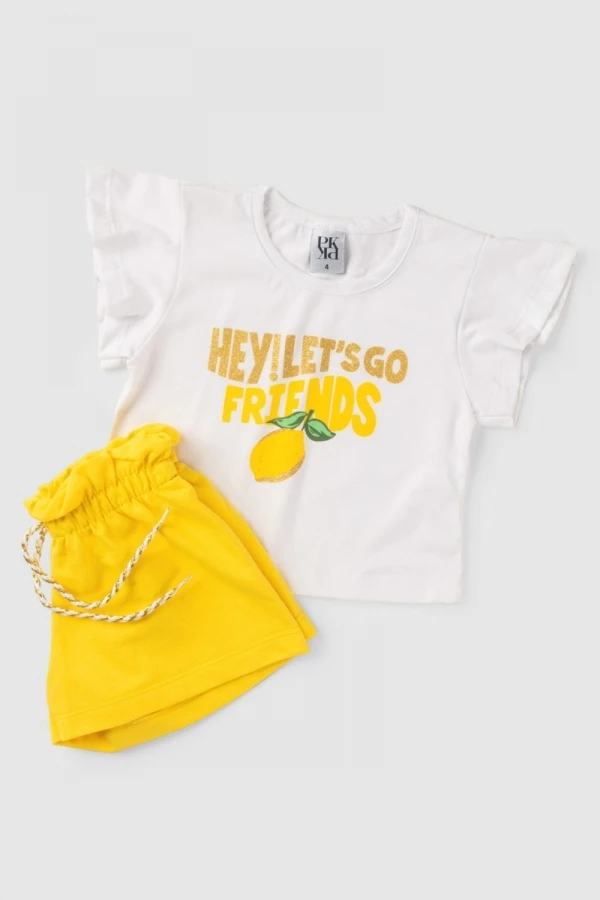 Precioso conjunto de jersey y camiseta. Blusa blanca con estampado de purpurina en la parte delantera y shorts amarillos con cordones decorativos. Todo pensado y producido con mucho amor y cuidado.
