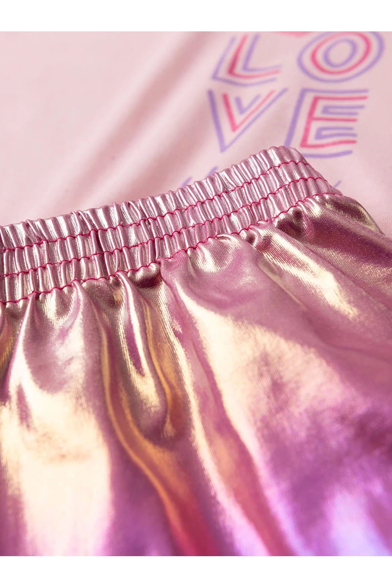 Camiseta 100% algodón con estampado frontal y short brillante, recomendamos lavar a mano.