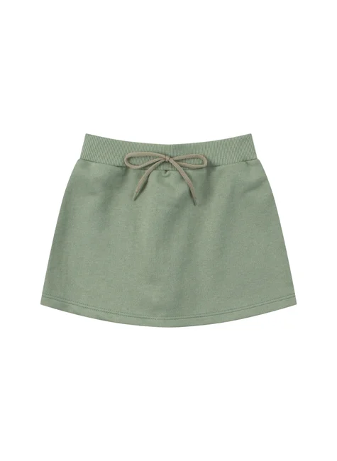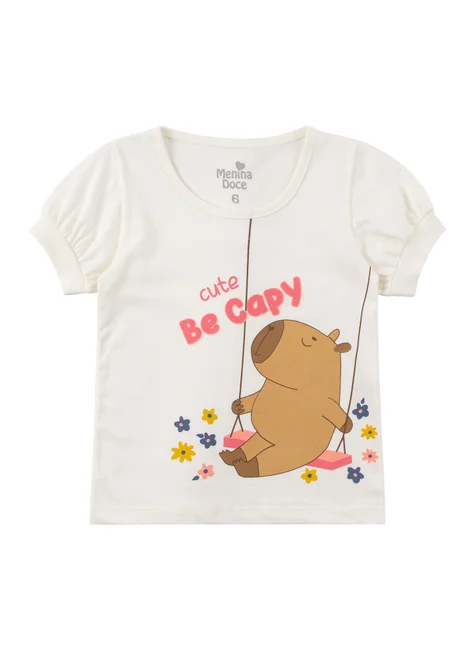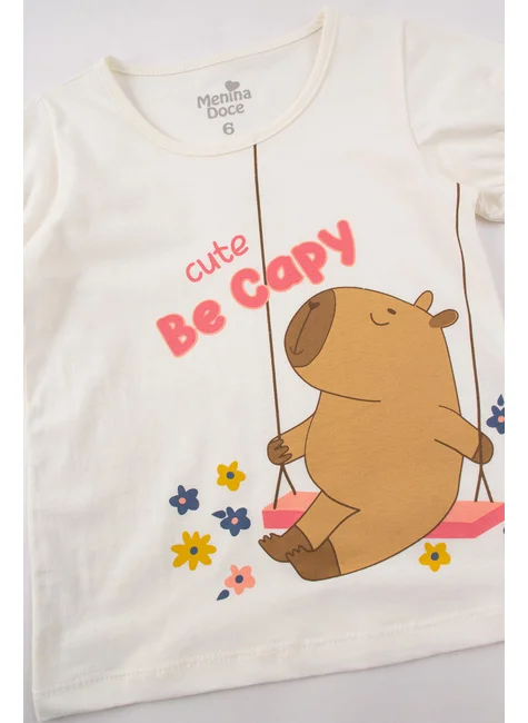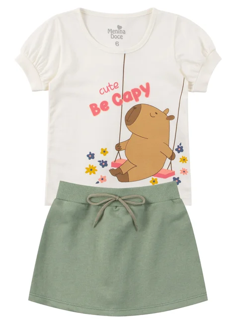Conjunto de punto medio Cute Be Capy Natural para niña, compuesto por dos piezas. Top de punto medio (100 % algodón), cuello redondo, estampado frontal y mangas con ribete acanalado. Falda corta de sudadera (75 % algodón, 25 % poliéster), cinturilla elástica acanalada con cordón decorativo frontal y solapa frontal.