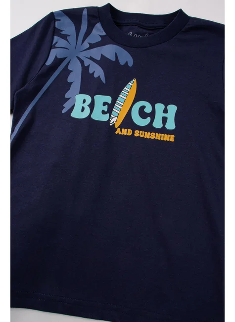 Conjunto de punto medio azul marino para niño , compuesto por dos piezas. Camiseta de punto medio (100 % algodón), cuello redondo y estampado frontal. Bermudas Saruel de sudadera (75 % algodón, 25 % poliéster), cinturilla elástica y cordón decorativo frontal, estampado frontal en una pierna.