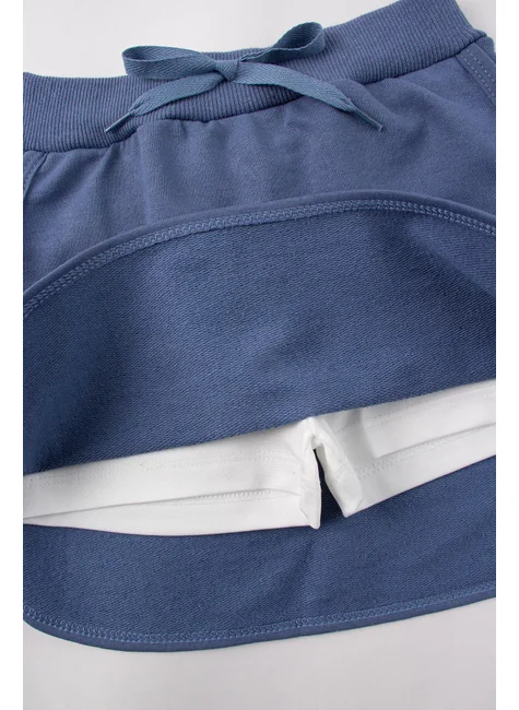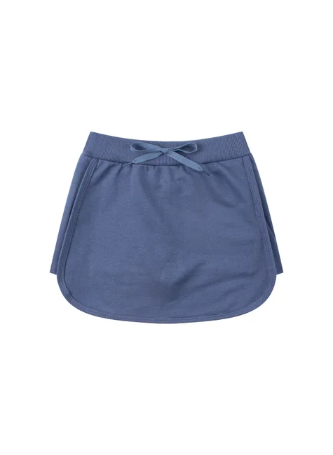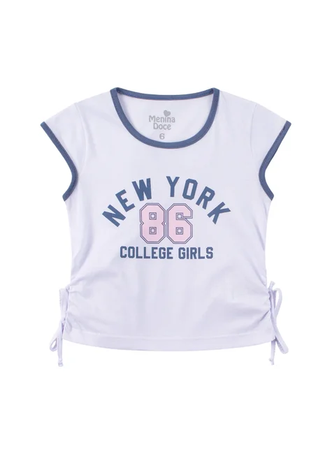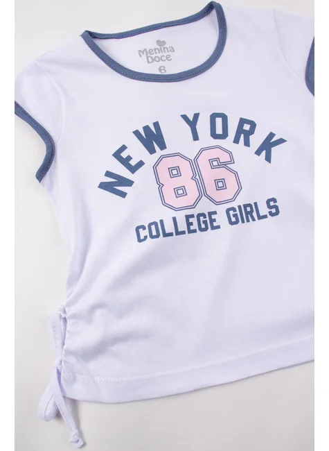 Conjunto de punto medio blanco New York para niña, compuesto por dos piezas. Blusa de punto medio (100 % algodón), cuello redondo con aplique en color de contraste, estampado frontal, mangas con ribete en color de contraste, detalles laterales con aplique decorativo de cordón fruncido y lazo. Falda y pantalón corto de tela de sudadera (75 % algodón, 25 % poliéster), cinturilla elástica con aplique decorativo de cordón frontal, pantalón corto interior de suplex (96 % poliéster, 4 % elastano) y forro.