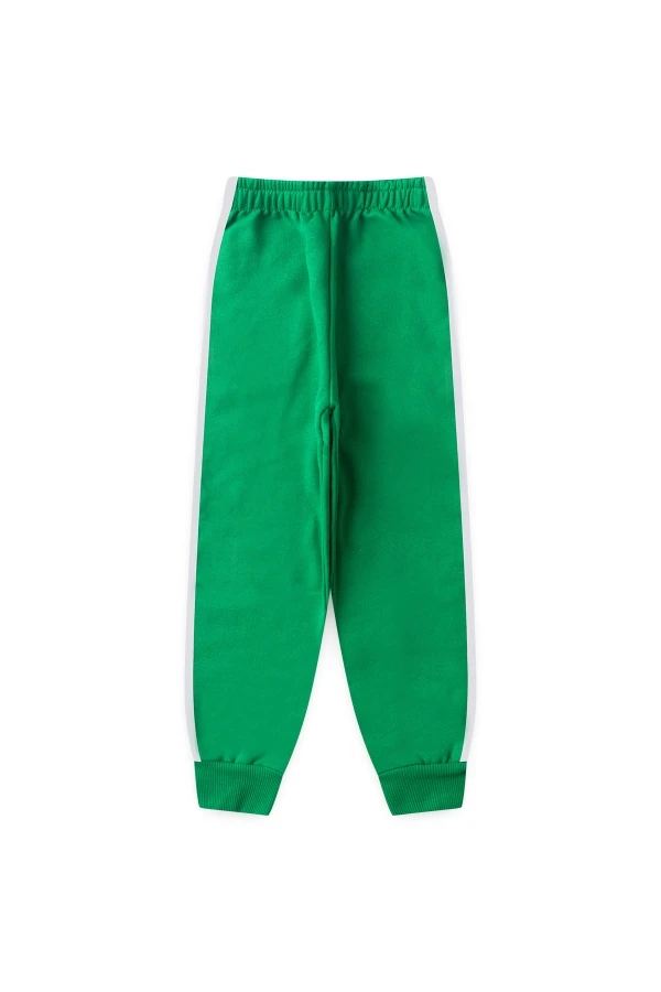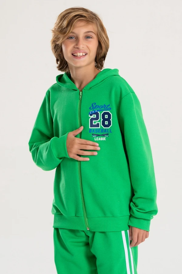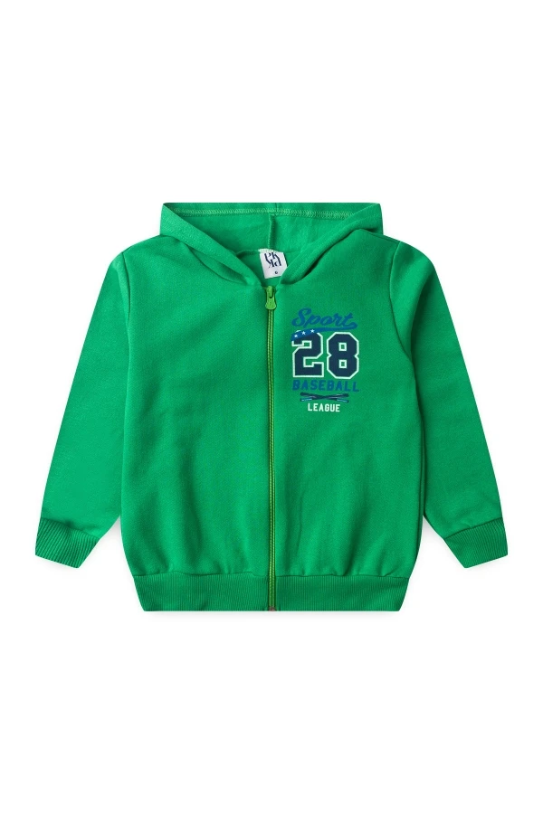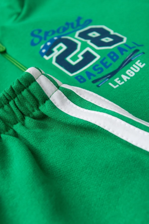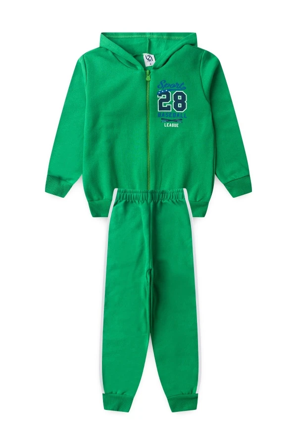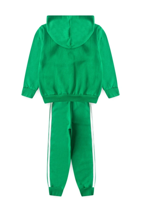 Conjunto moleton 50% algodón y 50% poliéster. Abrigo verde con cremallera, capucha y estampado frontal, pantalón también en verde con rayas laterales!