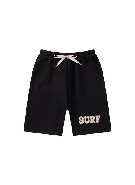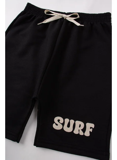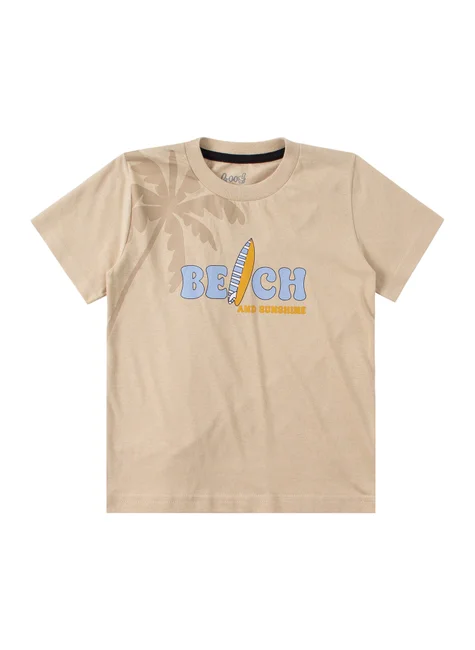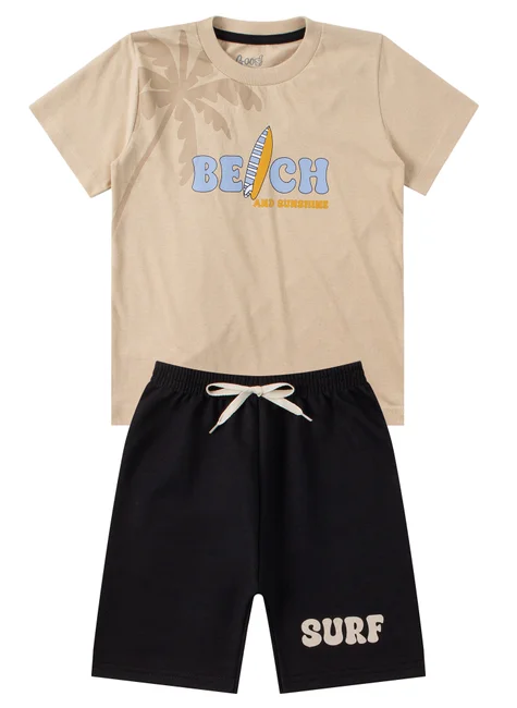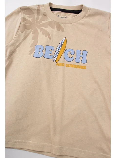 Conjunto de punto playero beige para niño , compuesto por dos piezas. Camiseta de punto medio (100 % algodón), cuello redondo y estampado frontal. Bermudas Saruel de sudadera (75 % algodón, 25 % poliéster), cinturilla elástica y cordón decorativo frontal, estampado frontal en una pierna.