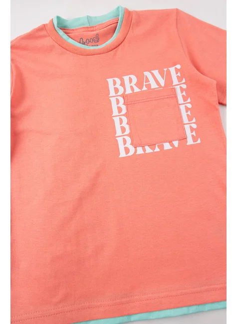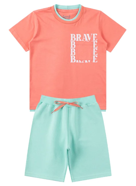 Conjunto Brave Coral para niño , compuesto por dos piezas. Camiseta de jersey (100 % algodón), cuello redondo con ribete bicolor, estampado frontal, aplicación de bolsillo funcional en la parte delantera y bajo con ribete en color de contraste. Bermudas de tejido de sudadera (75 % algodón, 25 % poliéster), cinturilla elástica acanalada y cordón decorativo en la parte delantera.