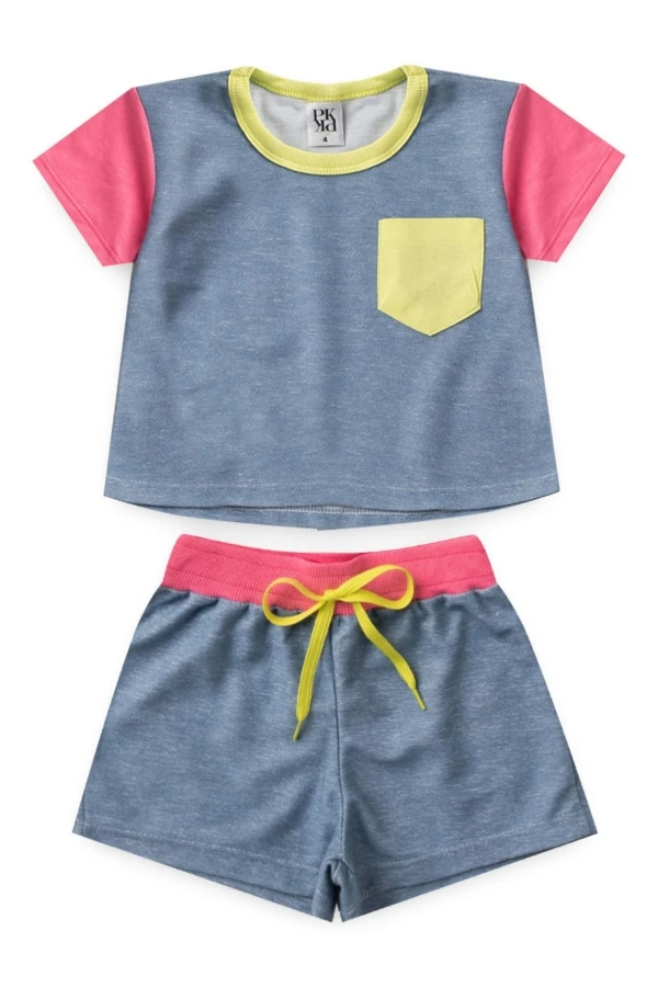 Conjunto de sudadera vaquera con detalles de tejido verde y rosa y cordones decorativos en el short.
