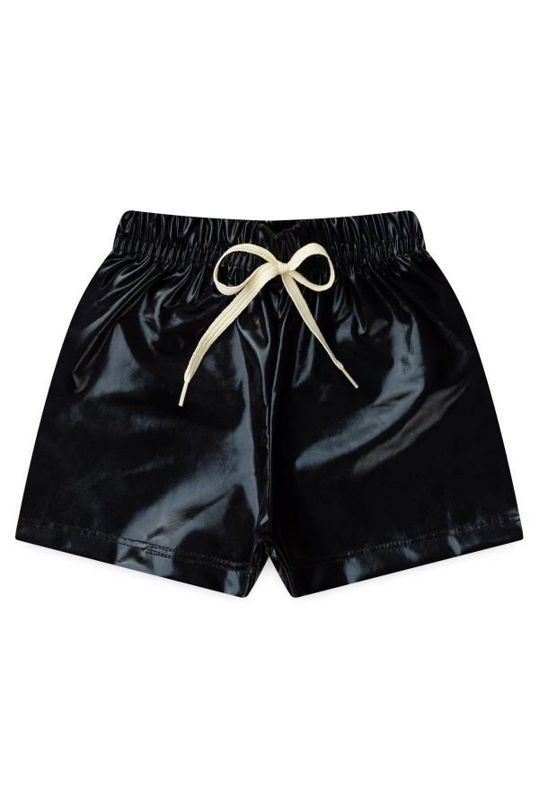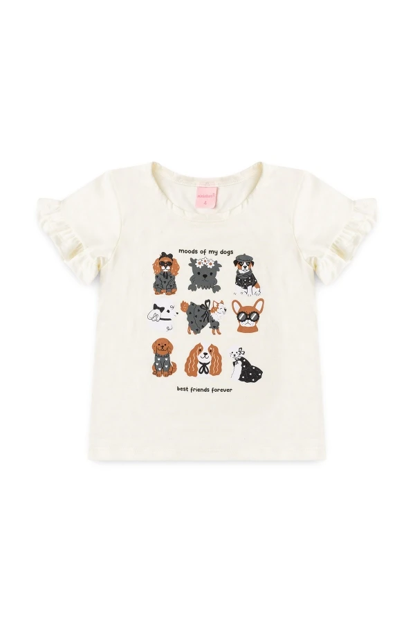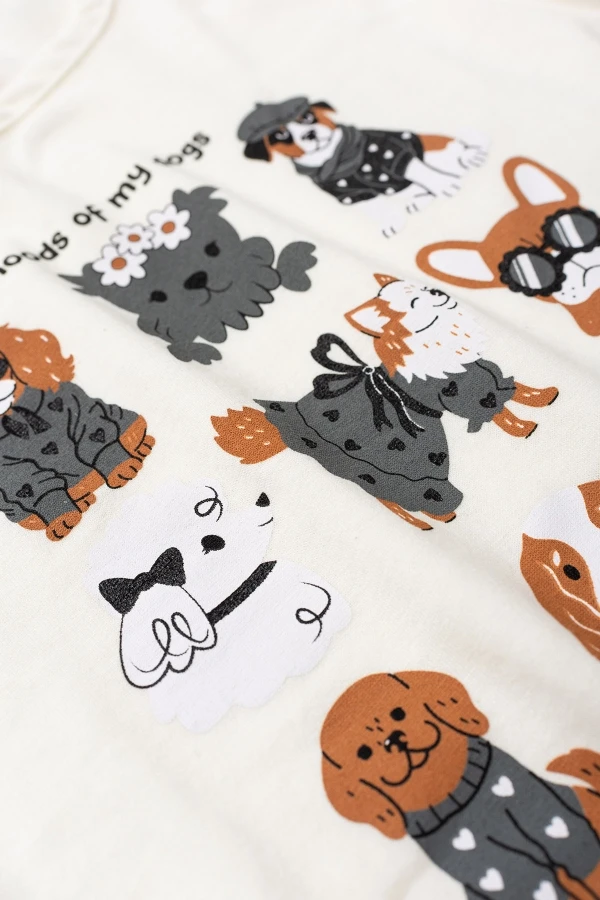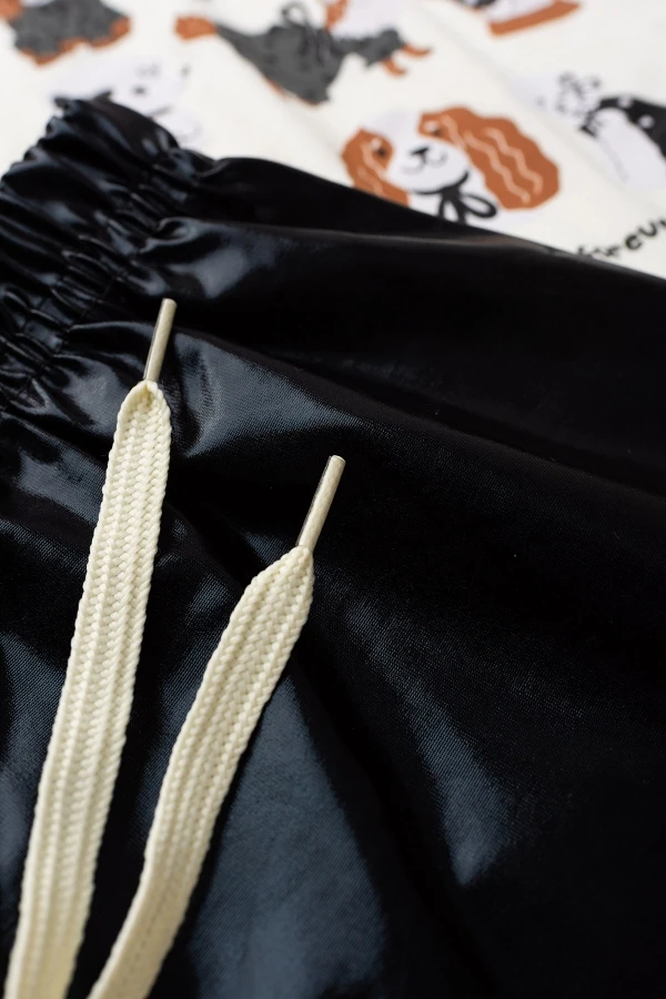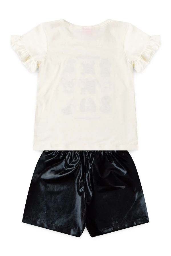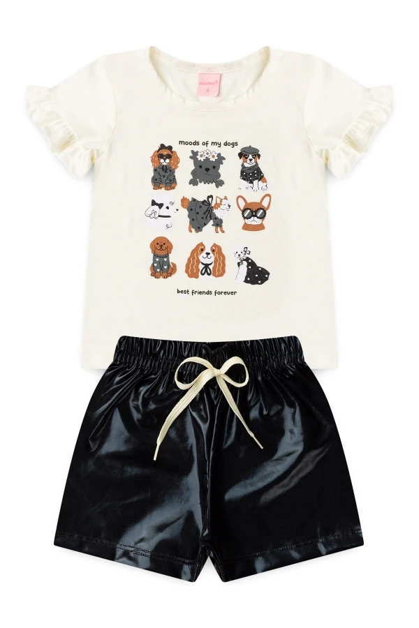 Un conjunto súper delicado de jersey y metalizado. El top color crema tiene encantadoras mangas con volantes y un estampado de perrito en la parte delantera. ¡Los shorts negros tienen un bonito cordón decorativo!