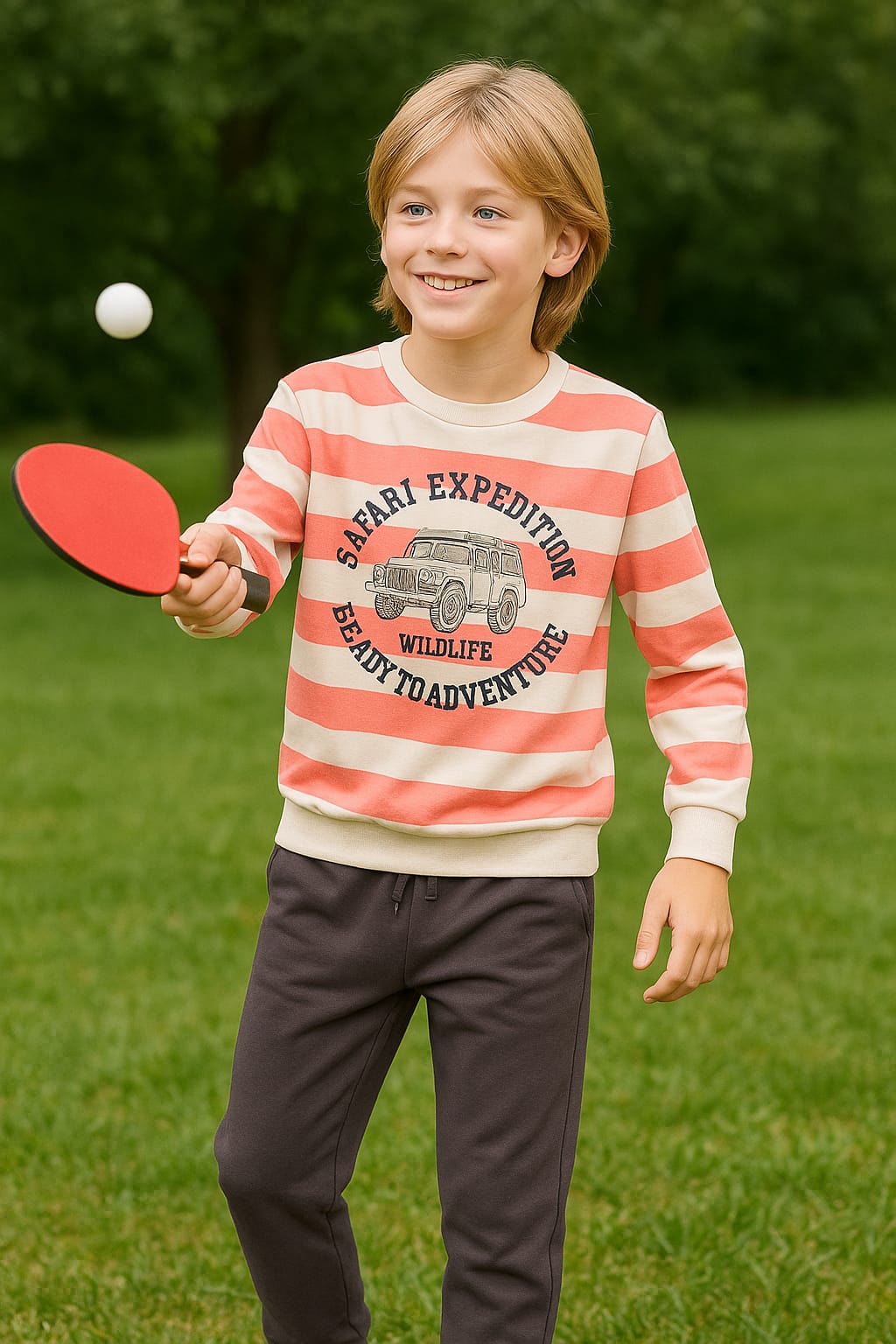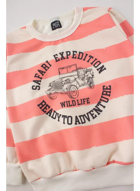 Conjunto para niño de felpa en color natural Wild Life con coral, compuesto por dos piezas. Moleton de felpa (75 % algodón, 25 % poliéster), cuello redondo acanalado, abertura frontal de felpa sublimada (75 % algodón, 25 % poliéster), estampado frontal, mangas de felpa sublimada (75 % algodón, 25 % poliéster), puños y bajo acanalados. Pantalón de felpa (75 % algodón, 25 % poliéster), cinturilla elástica y aplique de cordón decorativo en la parte delantera, puños acanalados.