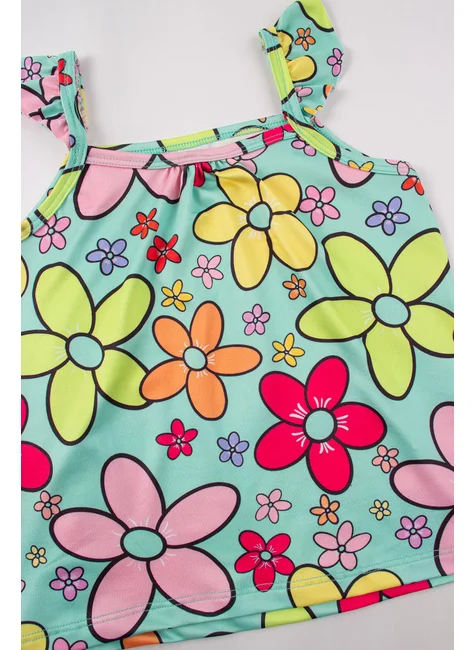 Conjunto de niña verde con flores y suplex sublimado, compuesto por dos piezas. Blusa de suplex sublimado (96 % poliéster, 4 % elastano), tirantes con volante. Falda corta de sudadera (75 % algodón, 25 % poliéster), cinturilla elástica y cordón decorativo frontal, solapa frontal.