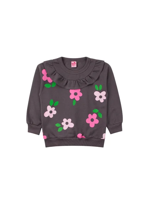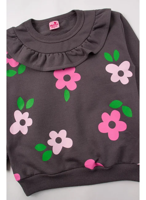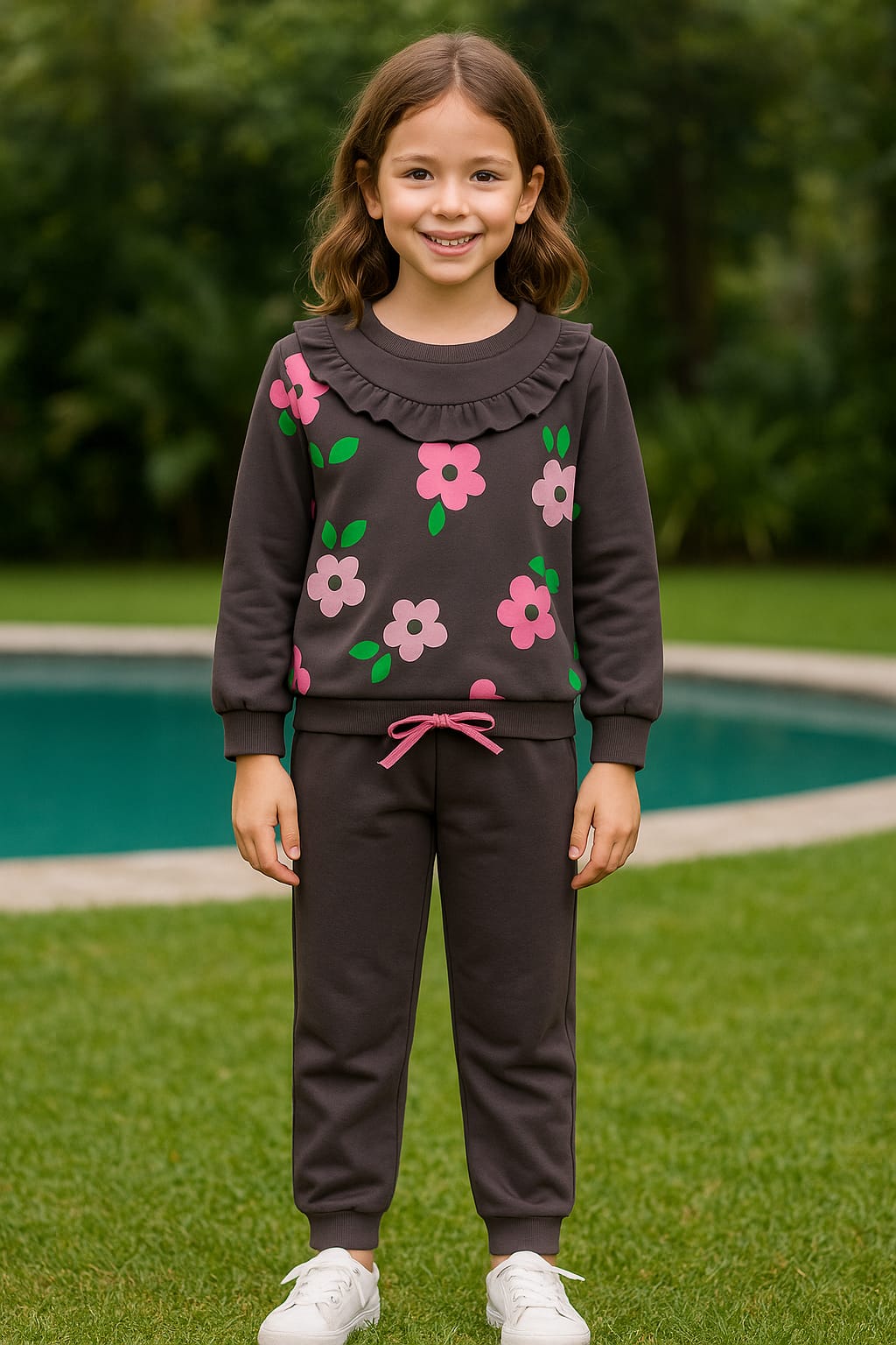 Conjunto de felpa para niña con flores de plomo, compuesto por dos piezas. Moleton de felpa (75 % algodón, 25 % poliéster), cuello redondo acanalado, volante delantero, estampado frontal, puños y bajo acanalados. Pantalón de felpa (75 % algodón, 25 % poliéster), cinturilla elástica, cordón decorativo delantero y puños acanalados.