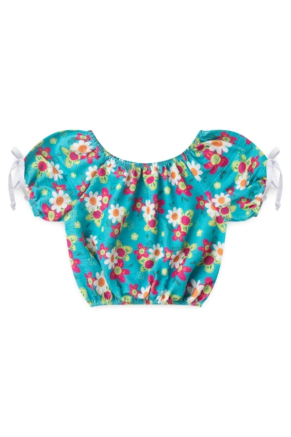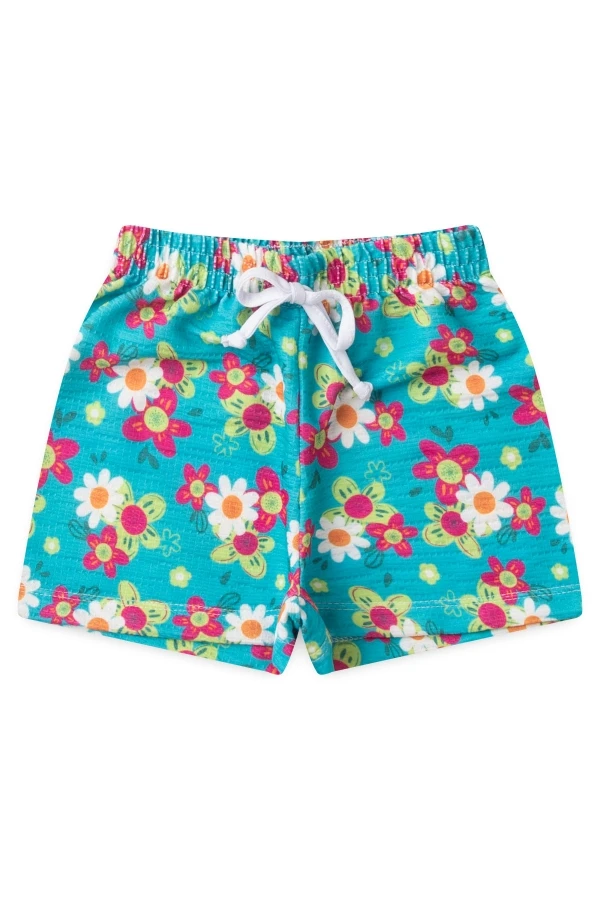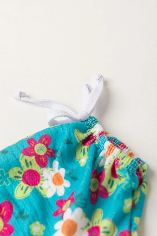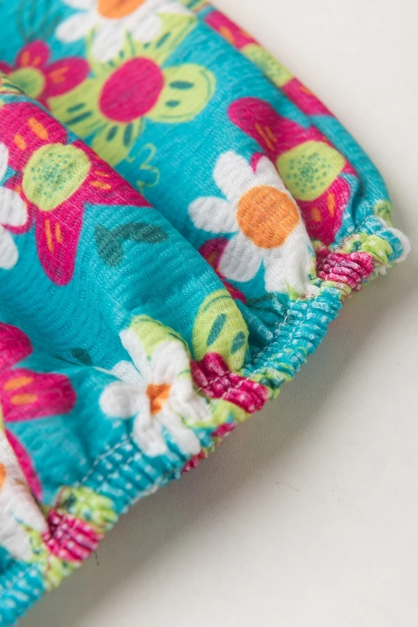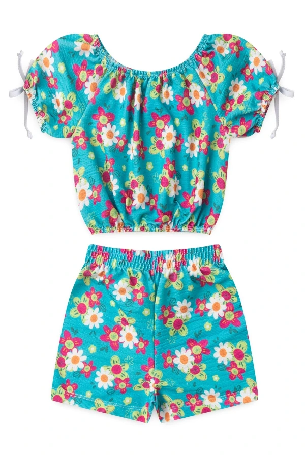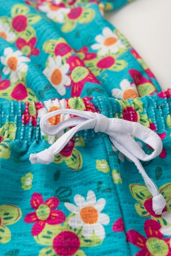 Conjunto de mujer en tela seersucker (96 % poliéster y 4 % elastano). Top turquesa con estampado de espirales y lazo en las mangas. Pantalón corto del mismo color con estampado de espirales y encaje decorativo precioso.