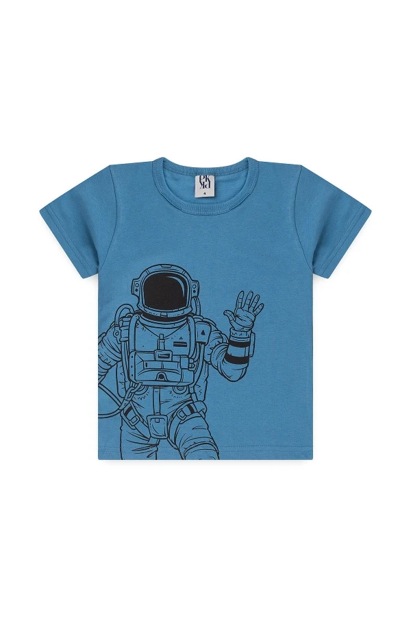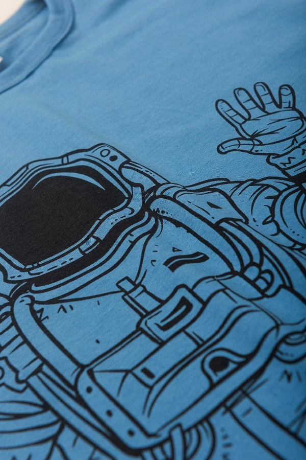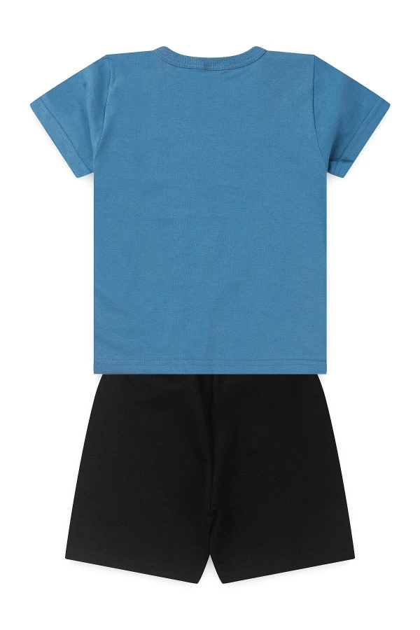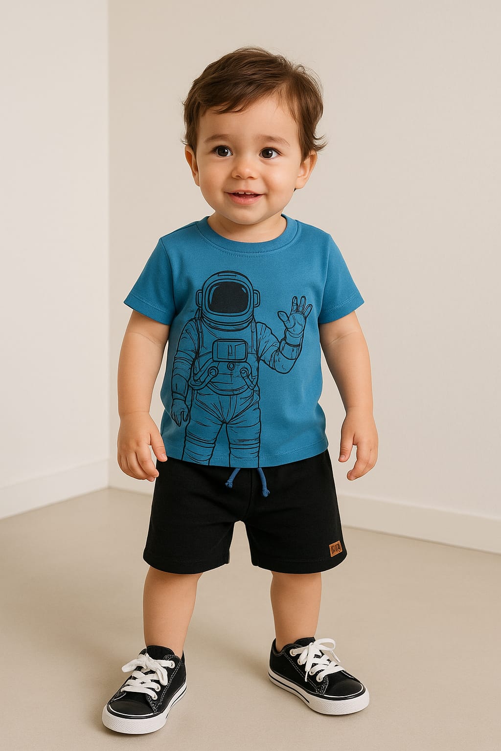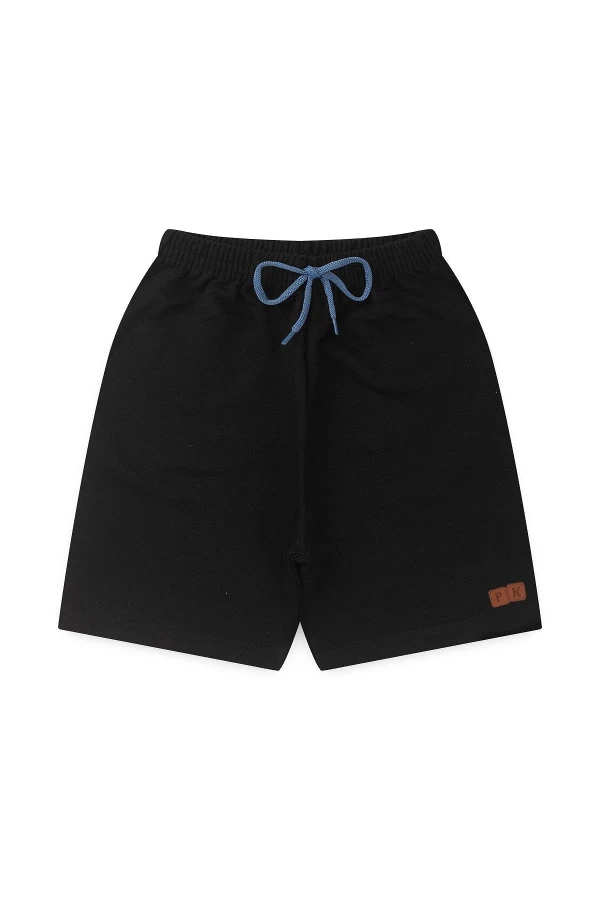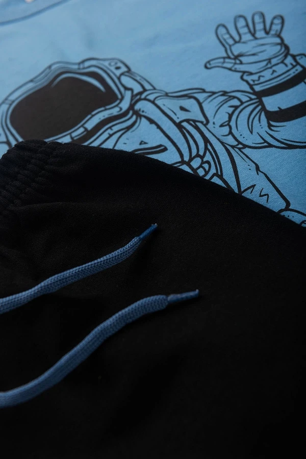 Conjunto de jersey y sudadera para hombre. Camiseta azul con estampado frontal y pantalón corto negro con cordones decorativos y parche PK.