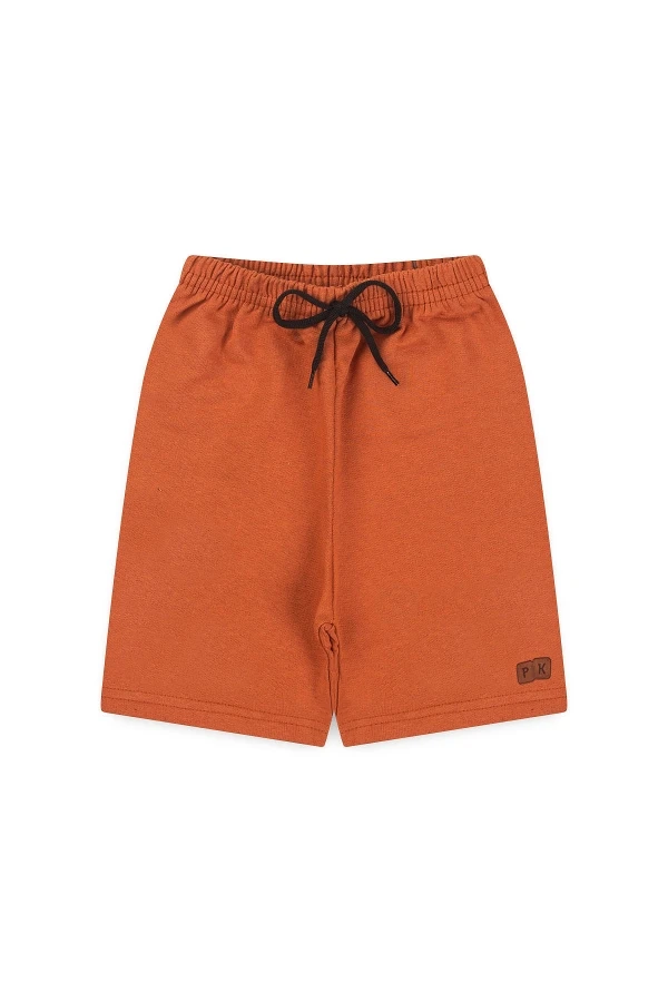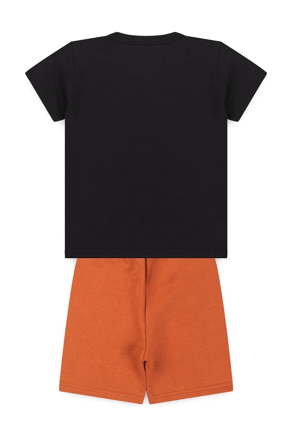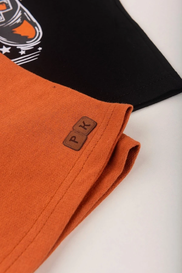 Conjunto de jersey y sudadera para hombre. Camiseta negra con estampado frontal y pantalón corto color óxido con cordones decorativos y parche PK.