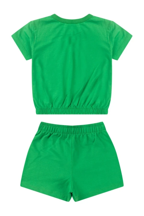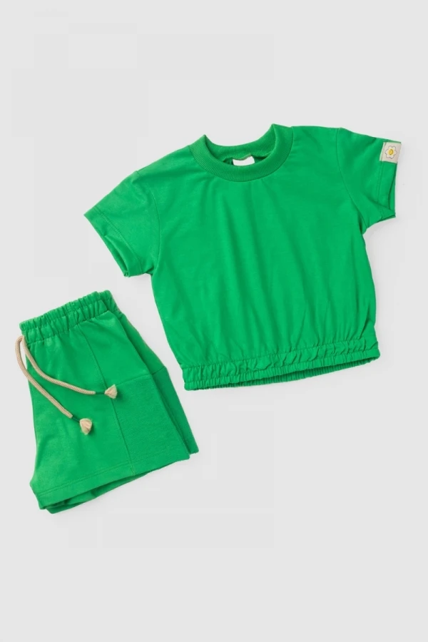 Conjunto súper mono. Top corto verde con etiqueta decorativa en la manga y elástico en el bajo, shorts del mismo color con cordones decorativos y detalles laterales.