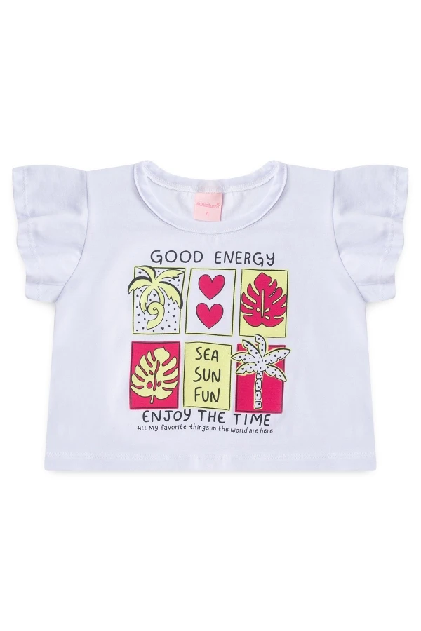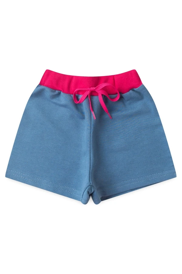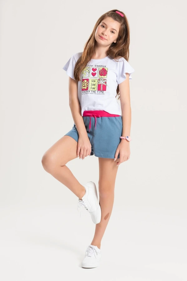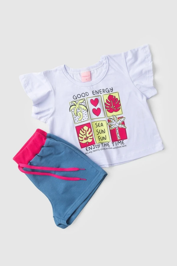 Conjunto de dos piezas confeccionado en jersey 100 % algodón en la parte superior y polar 100 % algodón en la inferior. Top corto blanco con volantes en las mangas y estampado frontal, y pantalón corto azul con un cordón decorativo muy mono.