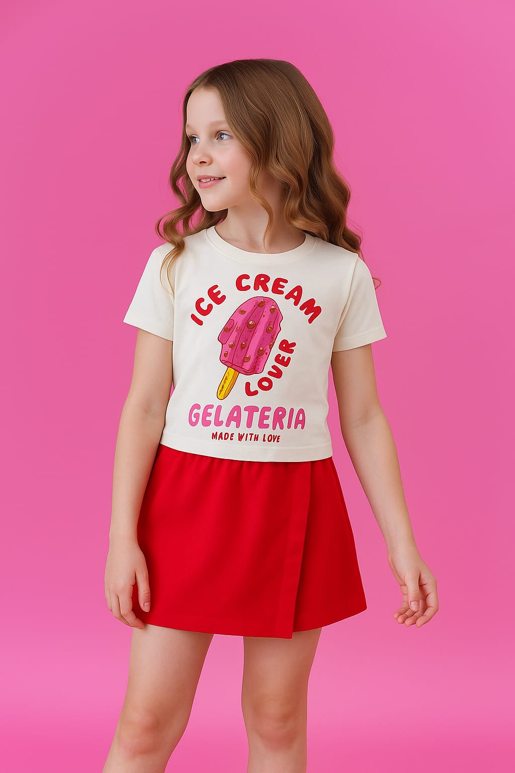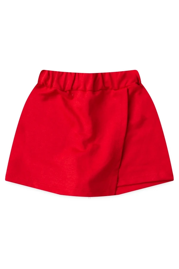 Un conjunto perfecto de dos piezas en punto jersey y polar. El top corto blanco roto luce un estampado brillante en la parte delantera, y la falda-pantalón roja tiene una capa superior.
