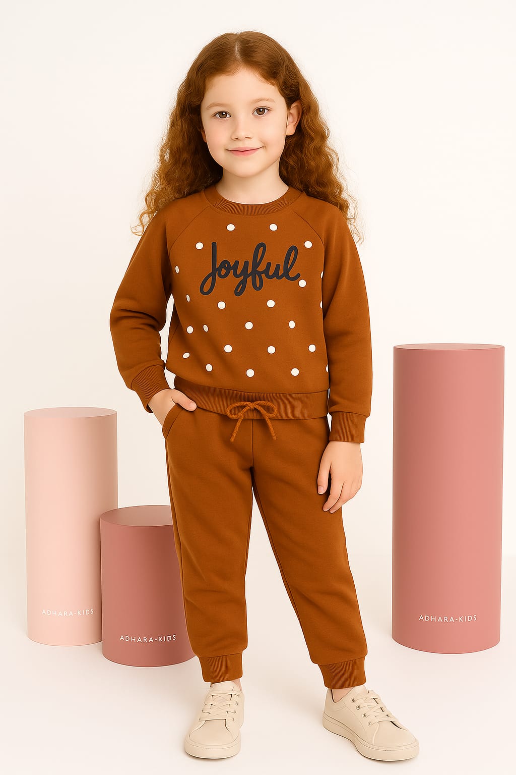 Conjunto de felpa de dos piezas para niños Joyful Caramel . Moleton de felpa (75 % algodón, 25 % poliéster), cuello redondo acanalado, estampado frontal con detalle abullonado en relieve, puños y bajo acanalados. Pantalón de felpa (75 % algodón, 25 % poliéster), cinturilla elástica con cordón decorativo en la parte delantera, perneras con pespunte recortado y puños acanalados.