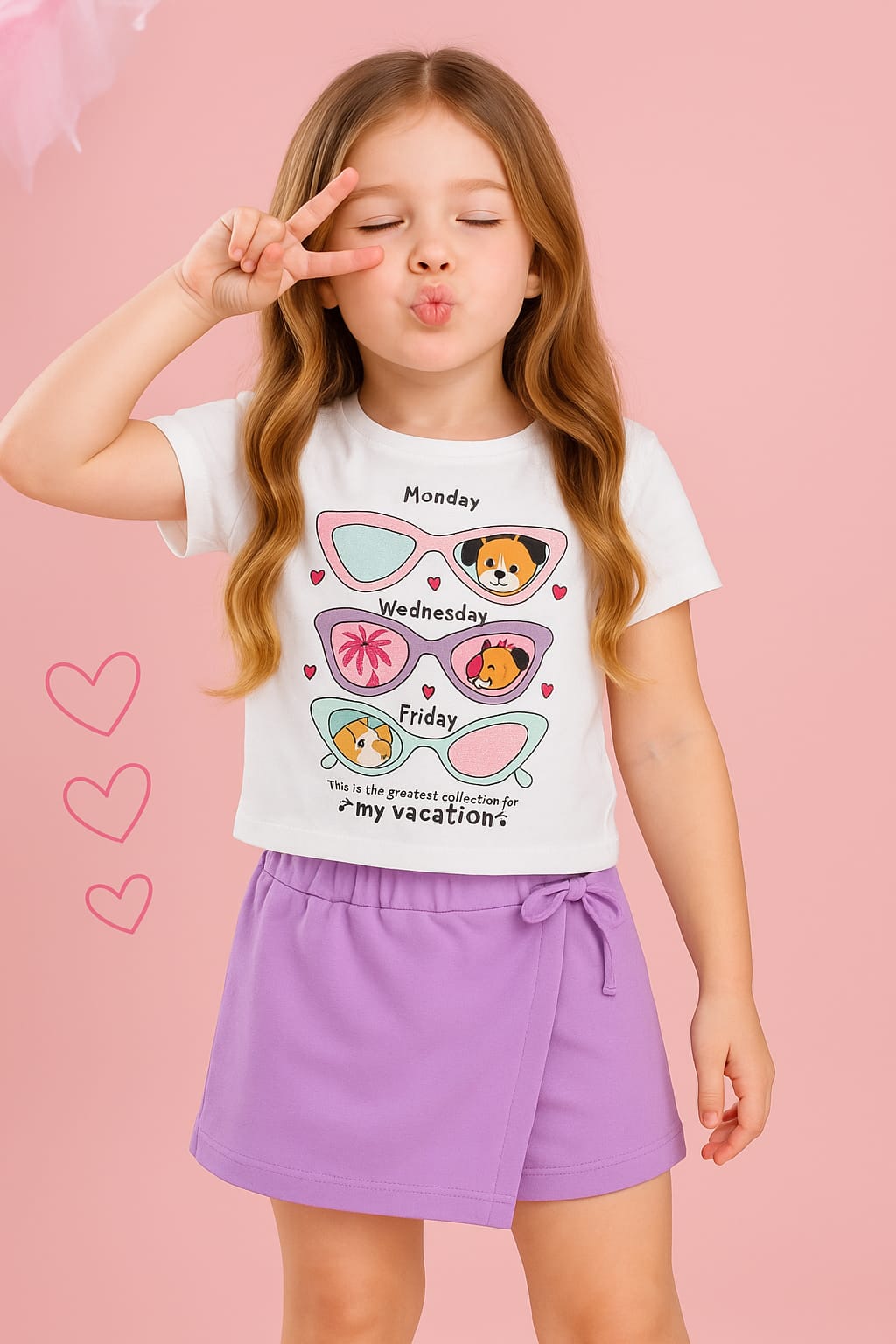 Un conjunto perfecto de dos piezas en punto jersey y polar. El top corto blanco luce un estampado brillante en la parte delantera, y los shorts lilas tienen una capa superpuesta y un cordón decorativo que le da un toque de encanto.