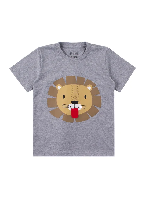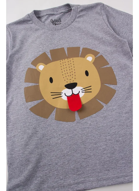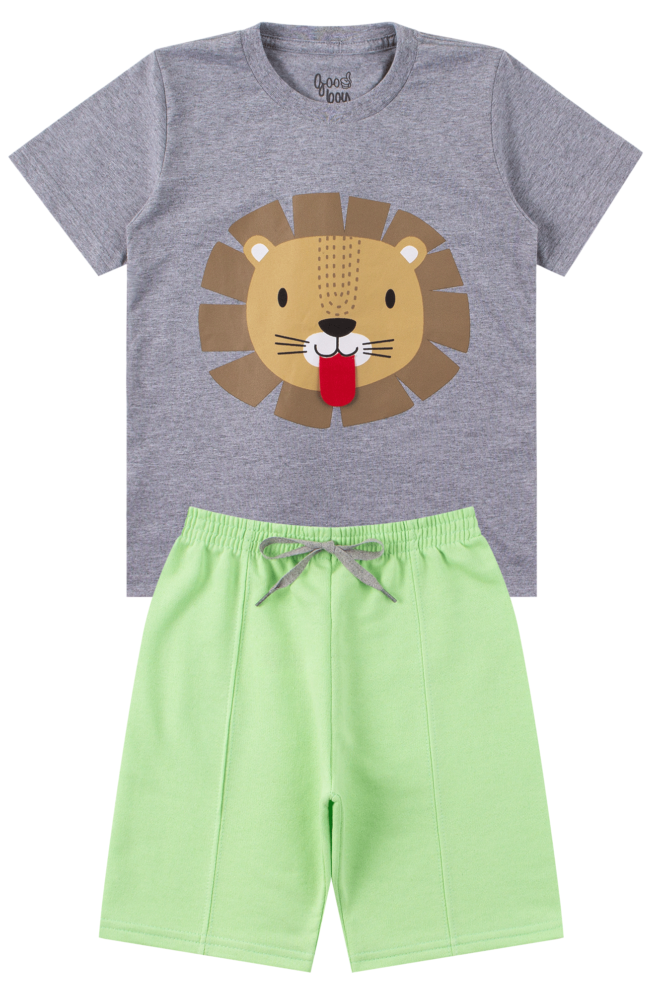 Conjunto de malla Lion para niño , compuesto por dos piezas. Camiseta de malla (al menos 85 % algodón), cuello redondo, estampado frontal con aplicación interactiva de fieltro. Bermudas de sudadera (75 % algodón, 25 % poliéster), cinturilla elástica y cordón decorativo frontal, y perneras con pespunte.
