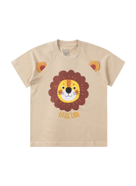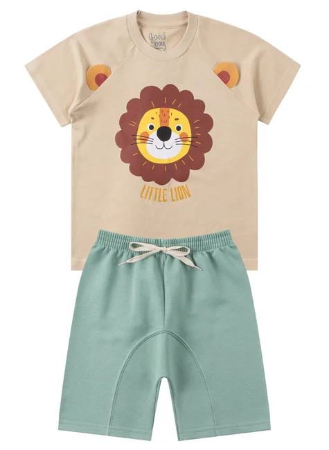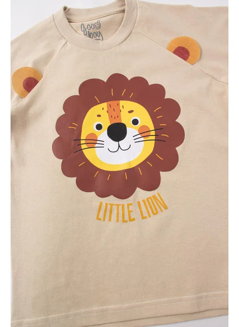 Conjunto de media malla Little Lion Beige para niño, compuesto por dos piezas. Camiseta de media malla (100 % algodón), cuello redondo, estampado frontal, aberturas frontales con aplique interactivo de orejas de fieltro. Bermudas Saruel de tejido de sudadera (75 % algodón, 25 % poliéster), cinturilla elástica y cordón decorativo frontal.