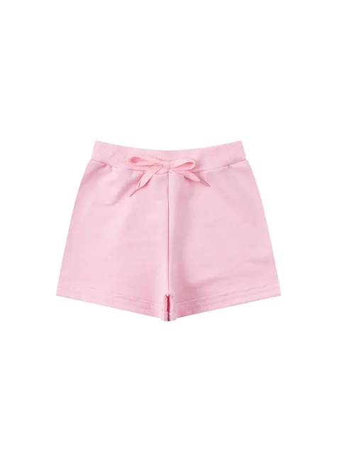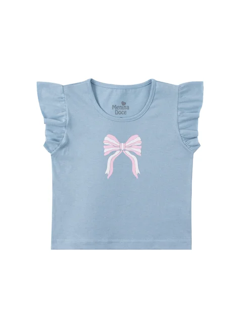 Conjunto de dos piezas para niña en punto medio con lazo azul cielo. Top de punto medio (100 % algodón), cuello redondo, estampado frontal con detalle de relieve abullonado y mangas fruncidas. Pantalón corto de sudadera (75 % algodón, 25 % poliéster), cinturilla elástica y cordón decorativo frontal.