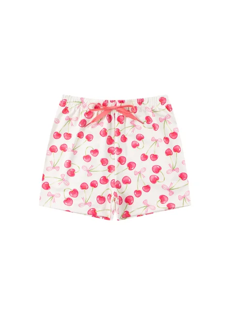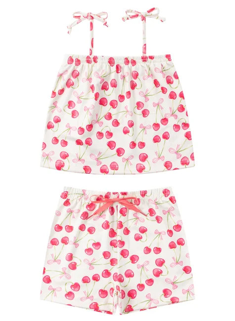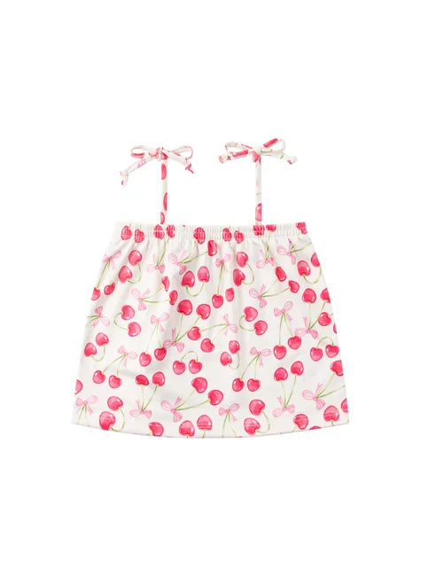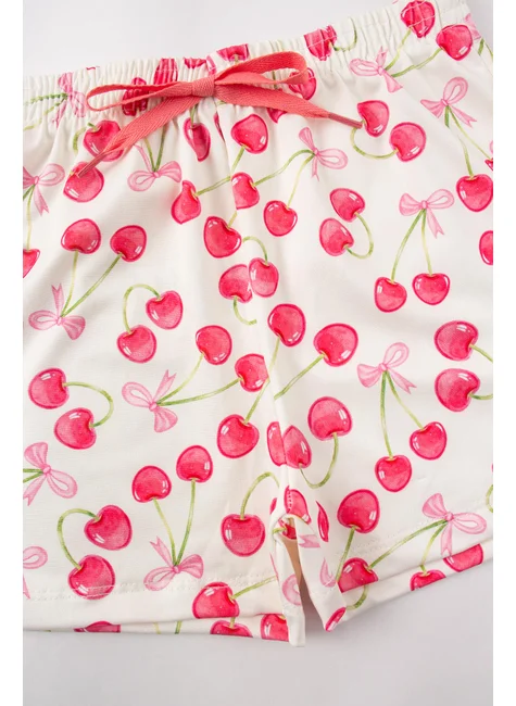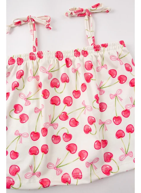Conjunto de dos piezas para niña de suplex sublimado color cereza natural . Blusa sin tirantes de suplex sublimado (96 % poliéster, 4 % elastano), tirantes con cierre de lazo, escote elástico y bajo con remate. Pantalón corto de suplex sublimado (96 % poliéster, 4 % elastano), cinturilla elástica y aplique frontal de cordón decorativo.