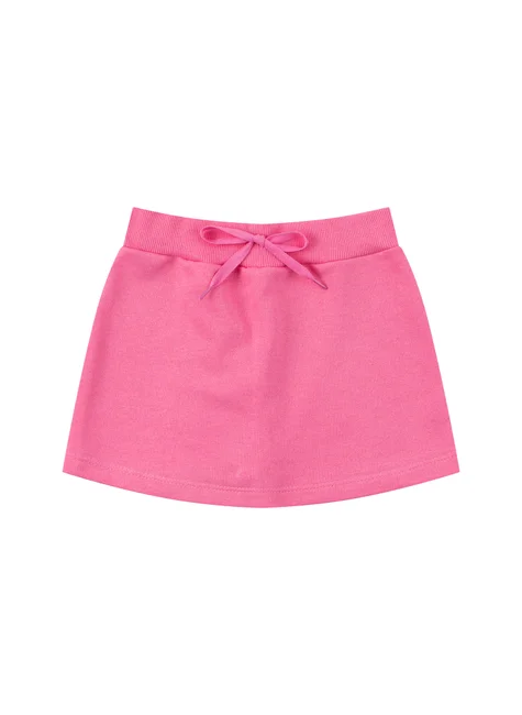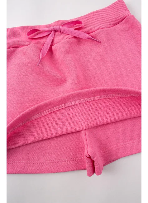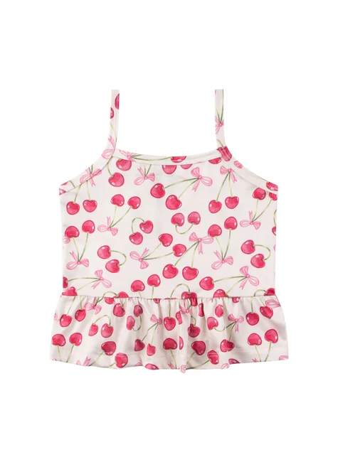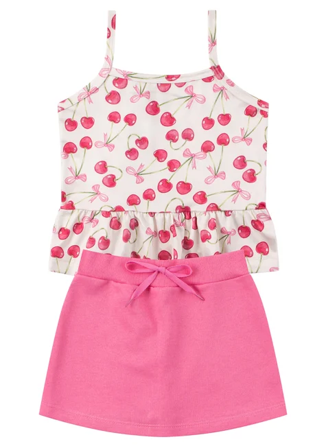 Conjunto de sudadera de niña de Suplex sublimado Natural Cherry compuesto por dos piezas. Blusa de suplex sublimado (96 % poliéster, 4 % elastano), tirantes y bajo con volante. Falda corta de sudadera (75 % algodón, 25 % poliéster), cinturilla elástica y cordón decorativo en la parte delantera, con solapa frontal.