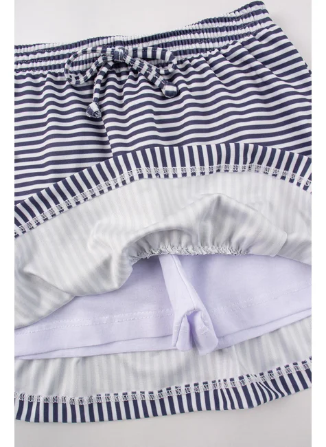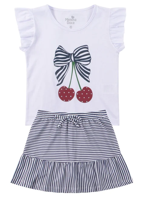 Conjunto de niña de media suplex sublimado en blanco cereza compuesto por dos piezas. Blusa de media malla (100 % algodón), cuello redondo, estampado frontal con aplique de pedrería y mangas fruncidas. Falda y pantalón corto de suplex sublimado (96 % poliéster, 4 % elastano), cinturilla elástica y aplique frontal de cordón decorativo. Pantalón corto interior de media malla (100 % algodón) con volante.