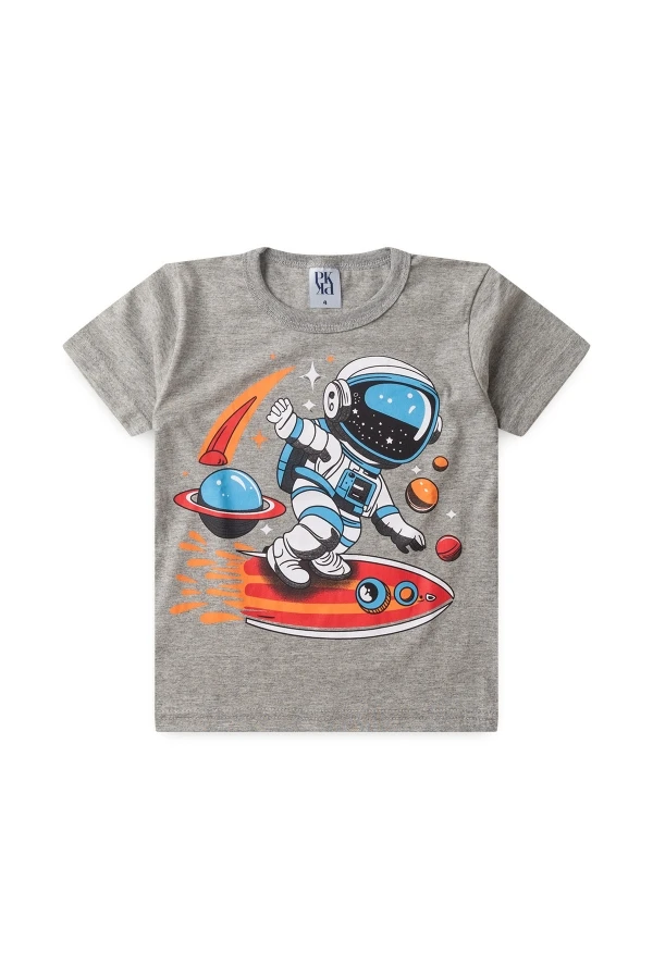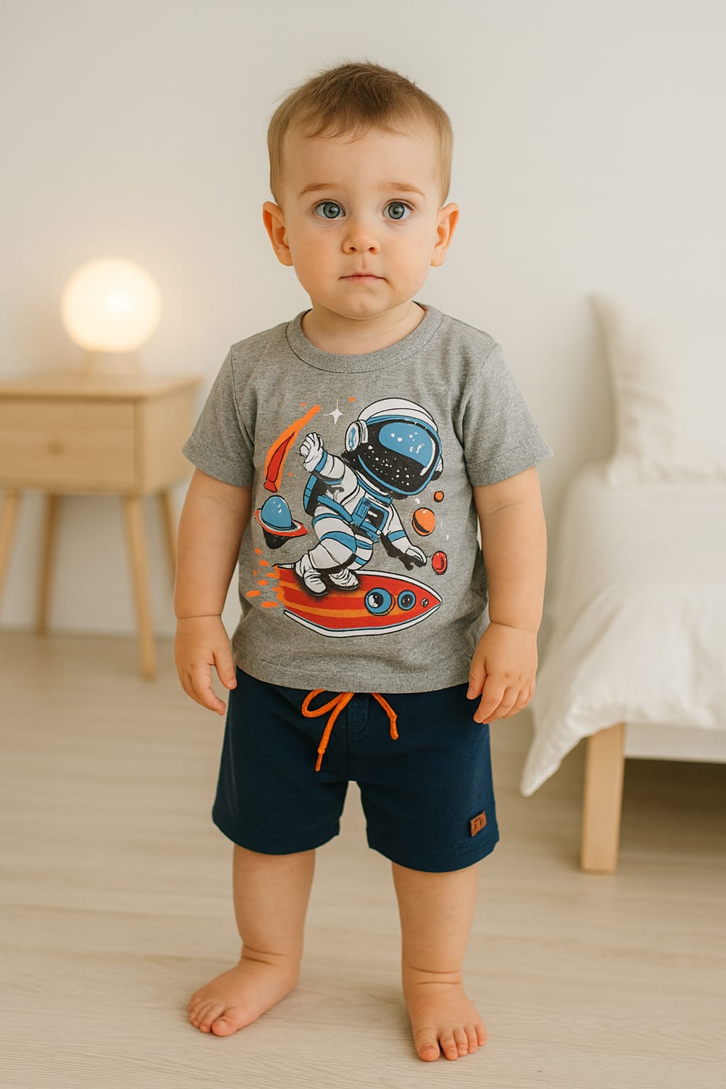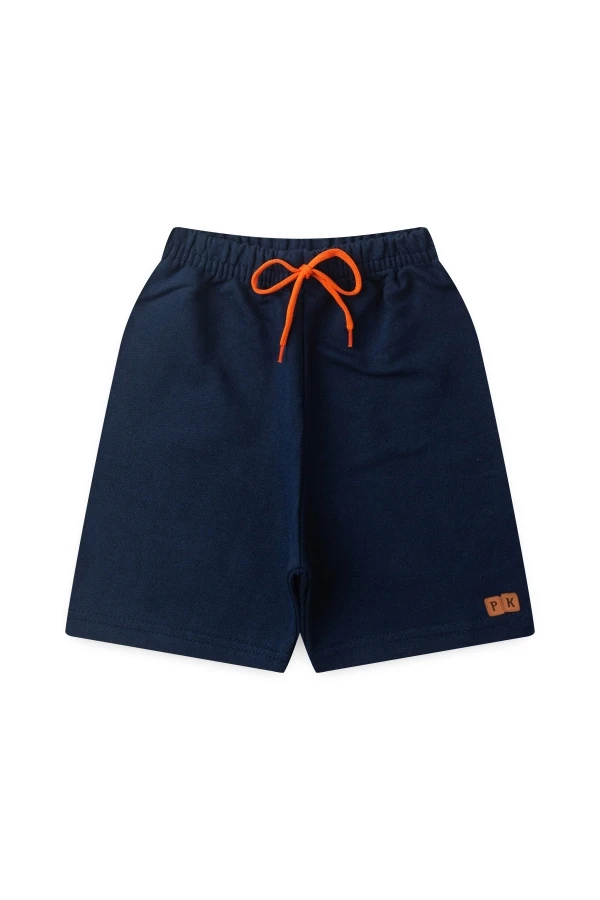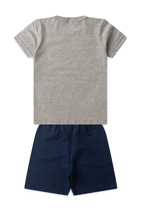 Conjunto para hombre en jersey 100 % algodón y tejido de sudadera. Camiseta jaspeada con un bonito estampado frontal y pantalón corto azul marino con cordones decorativos y parche frontal.