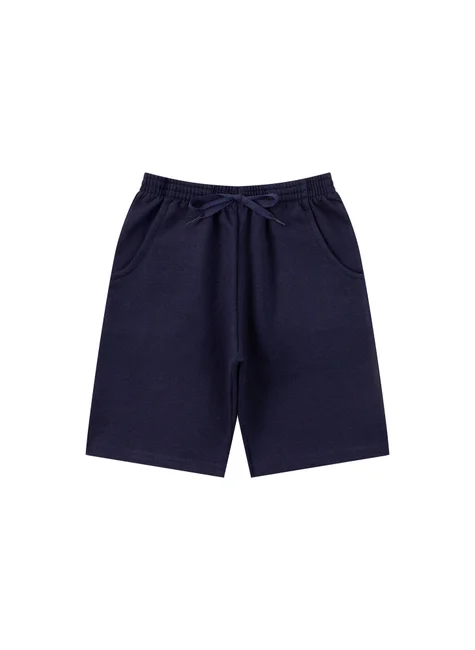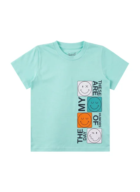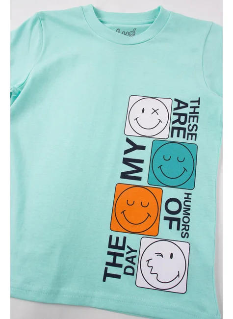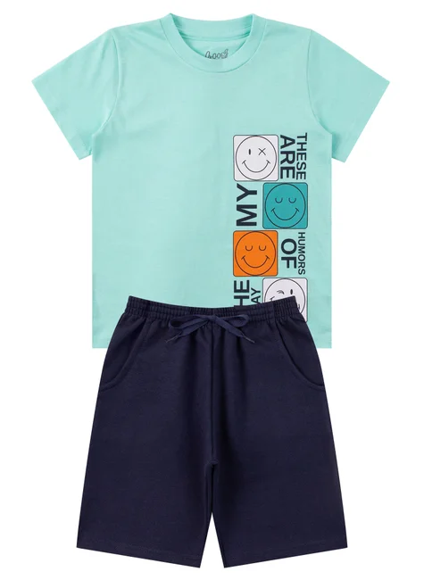Conjunto de media malla para niño en color verde agua Humors, compuesto por dos piezas. Camiseta de media malla (100 % algodón), cuello redondo y estampado frontal. Bermudas de sudadera (75 % algodón, 25 % poliéster), cinturilla elástica y cordón decorativo frontal, bolsillos frontales funcionales.