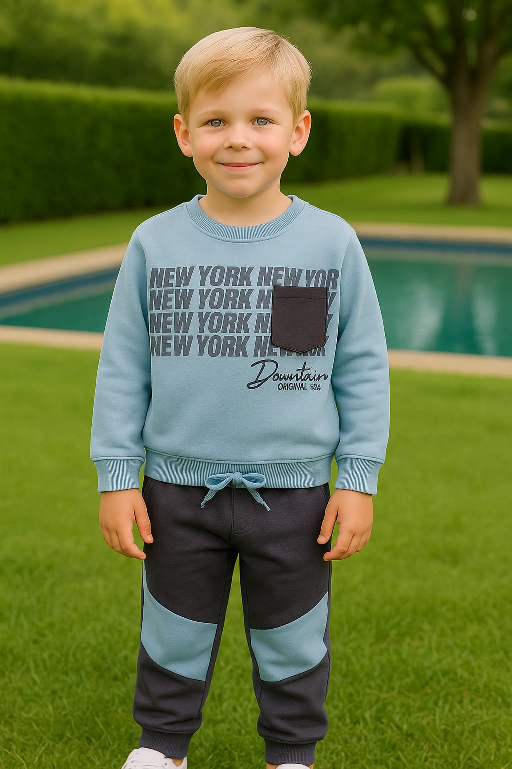 Conjunto de felpa New York azul claro para niño, compuesto por dos piezas. Moleton de felpa (75 % algodón, 25 % poliéster), cuello redondo acanalado, estampado frontal, aplicación frontal funcional en color de contraste (75 % algodón, 25 % poliéster), puños y bajo acanalados. Pantalón de felpa (75 % algodón, 25 % poliéster), cinturilla elástica y cordón decorativo en la parte delantera, aberturas frontales con aplicaciones en color de contraste (75 % algodón, 25 % poliéster), puños acanalados.