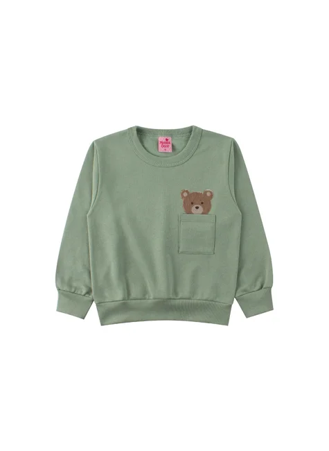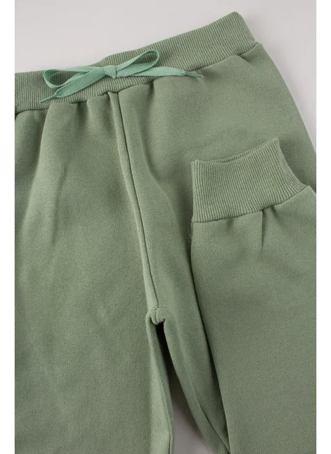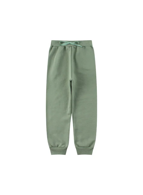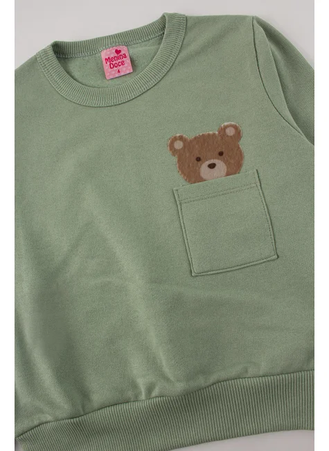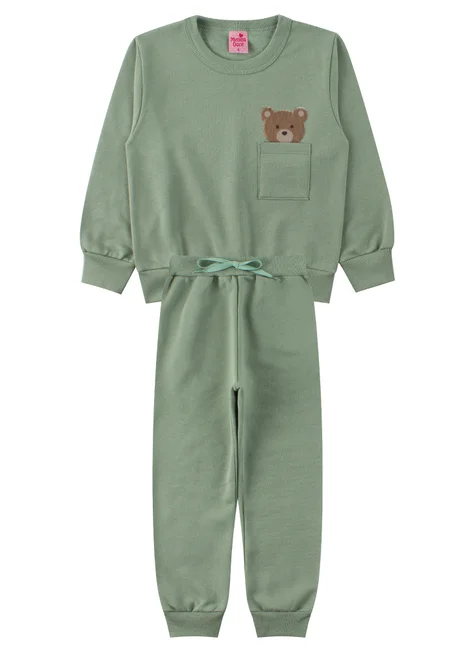 Conjunto para niña, de peluche con oso, color verde malva, compuesto por dos piezas. MOleton de felpa (75 % algodón, 25 % poliéster), cuello redondo acanalado, bolsillo funcional y apliques de peluche de oso en la parte delantera, puños y bajo acanalados. Pantalón de felpa (75 % algodón, 25 % poliéster), cinturilla elástica acanalada y aplique de cordón decorativo en la parte delantera, puños acanalados.