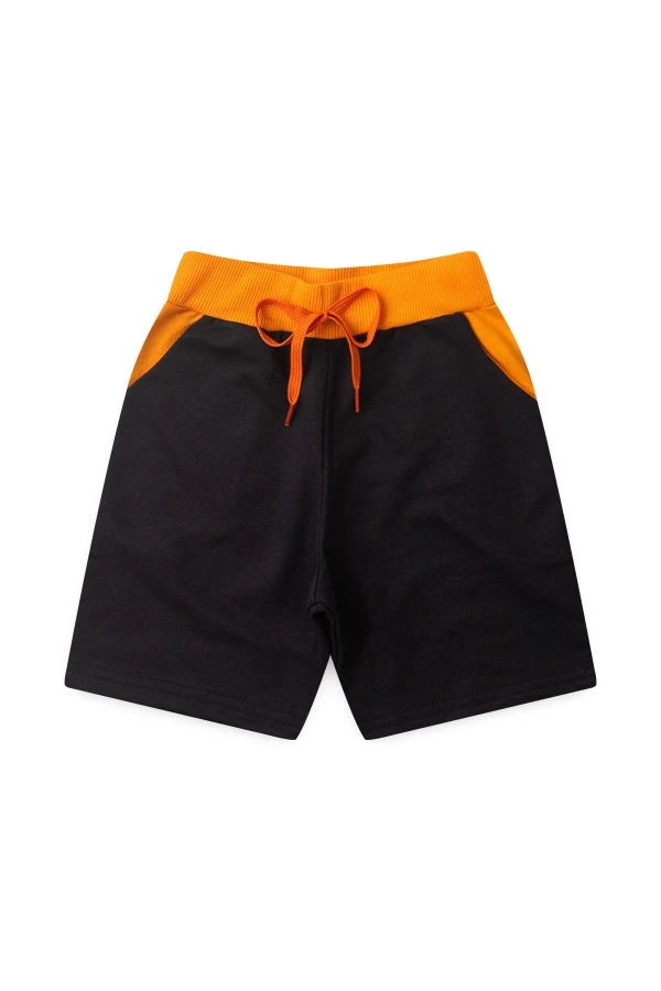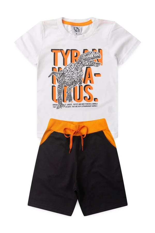 Conjunto para hombre súper mono en jersey y sudadera. Camiseta blanca con estampado frontal y pantalón corto negro con cinturilla acanalada naranja y cordones decorativos.