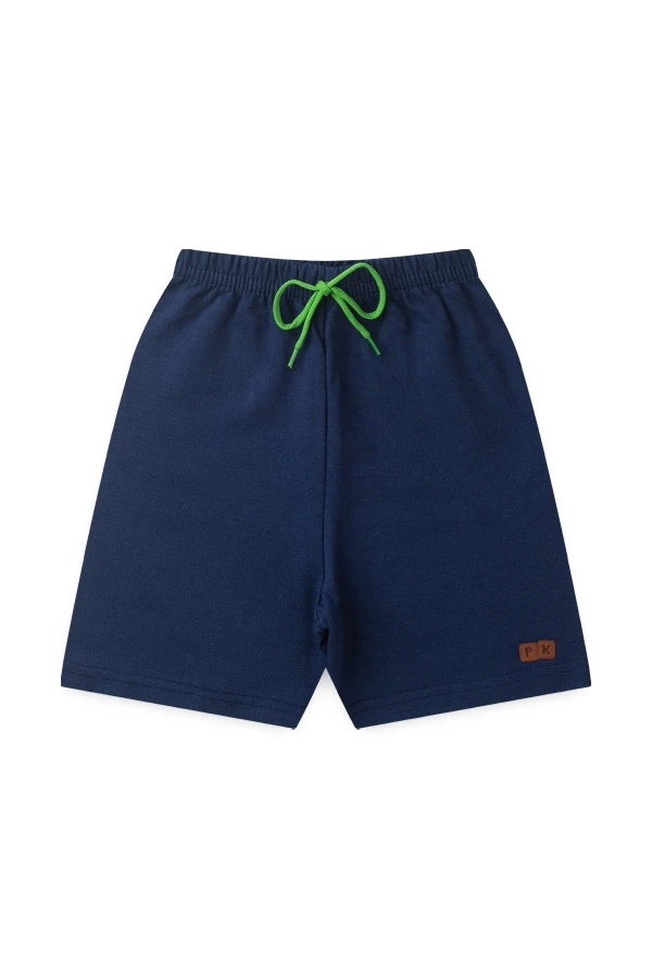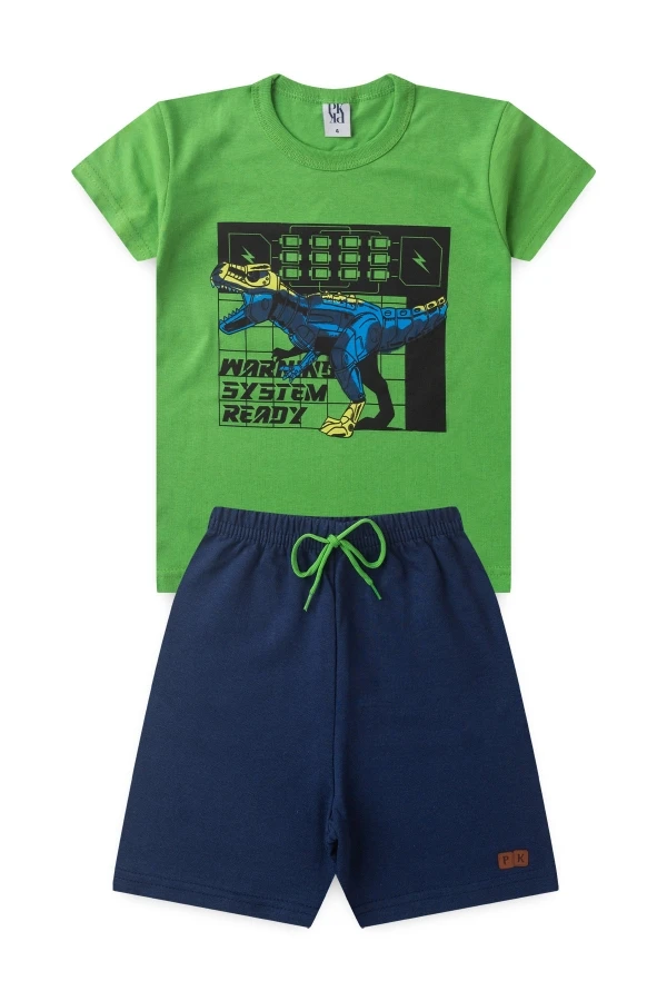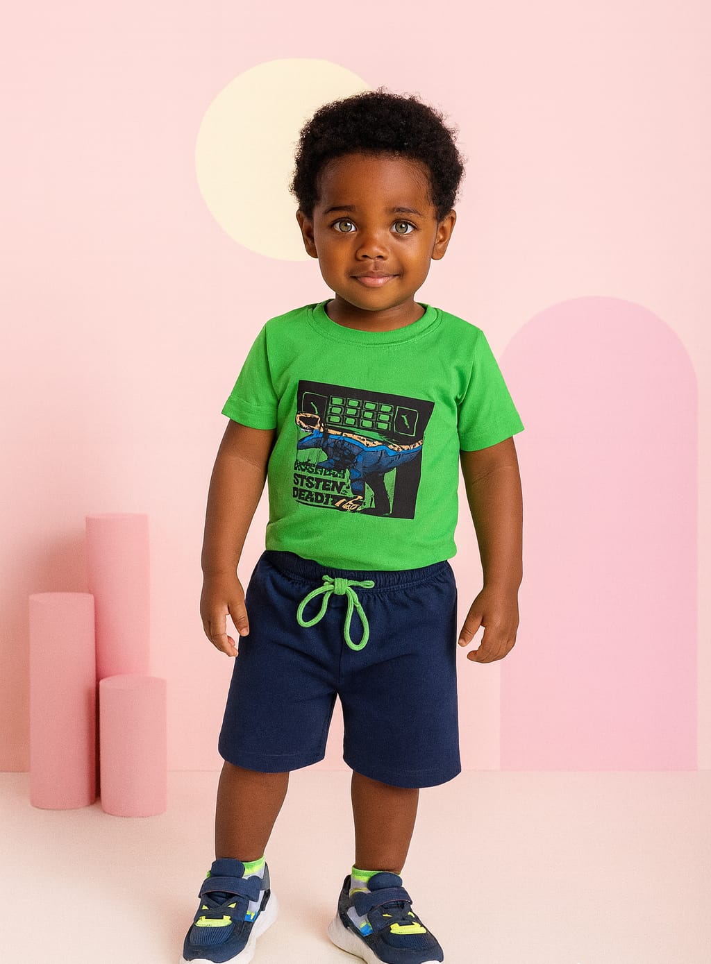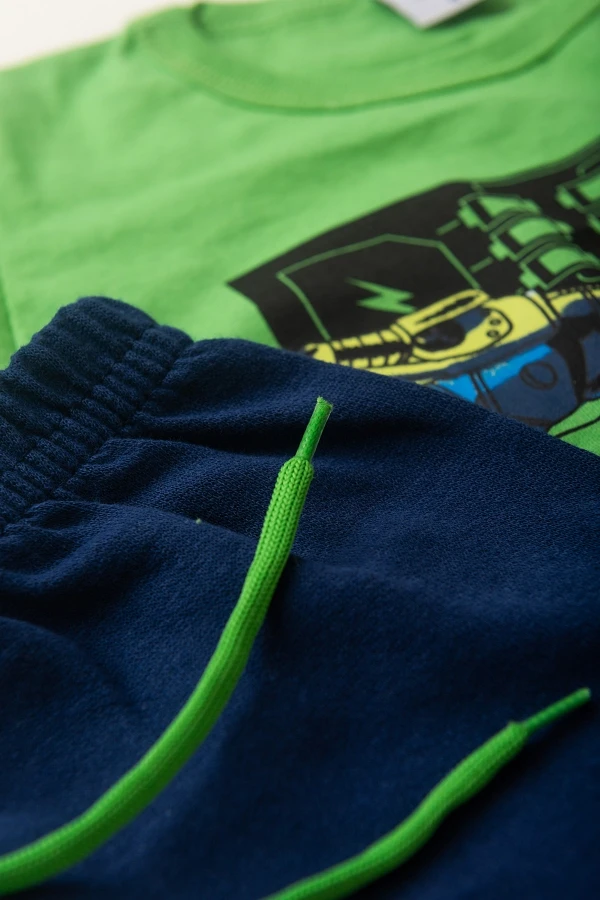 Conjunto de jersey y sudadera para hombre. Camiseta verde con estampado frontal y pantalón corto azul marino con cordones decorativos.