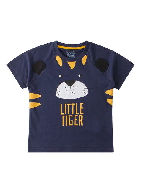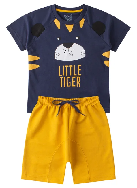 Conjunto de jersey Little Tiger azul marino para niño, compuesto por dos piezas. Camiseta de jersey (100 % algodón), cuello redondo, estampado frontal con aplique interactivo de orejas de fieltro. Bermudas Saruel de tejido de sudadera (75 % algodón, 25 % poliéster), cinturilla elástica y aplique decorativo frontal con cordón ajustable.