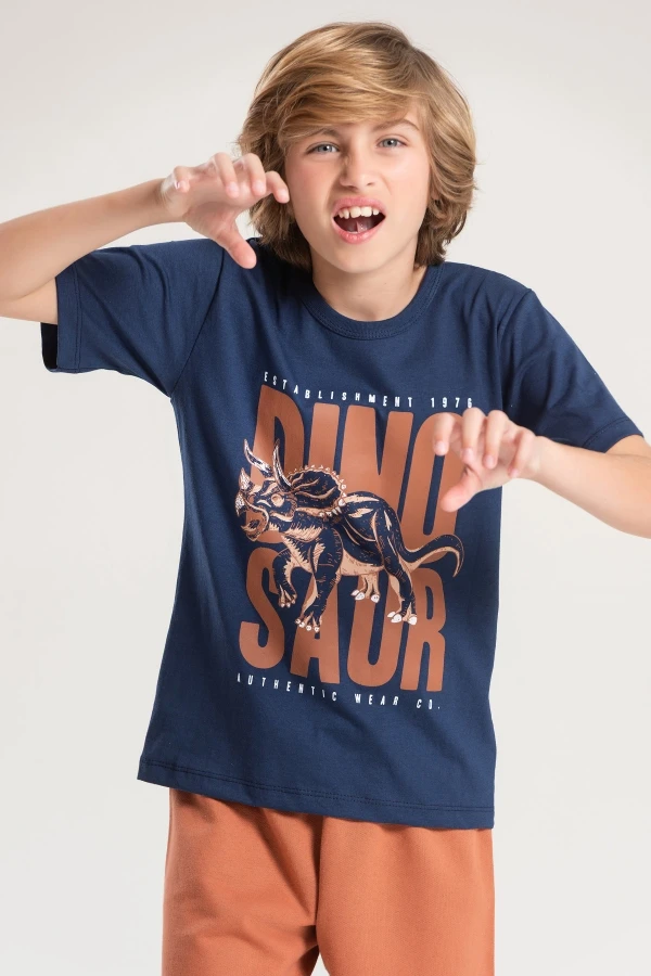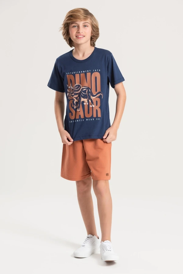 Conjunto de jersey y sudadera para hombre. Camiseta azul marino con estampado frontal y pantalón corto color óxido con cordones decorativos.