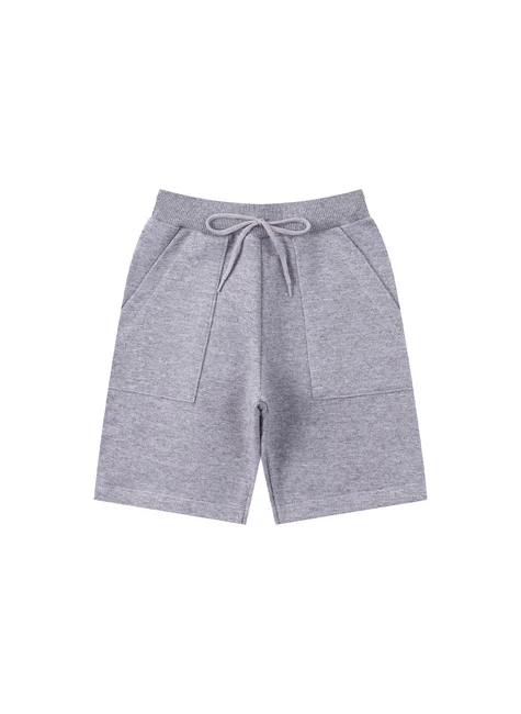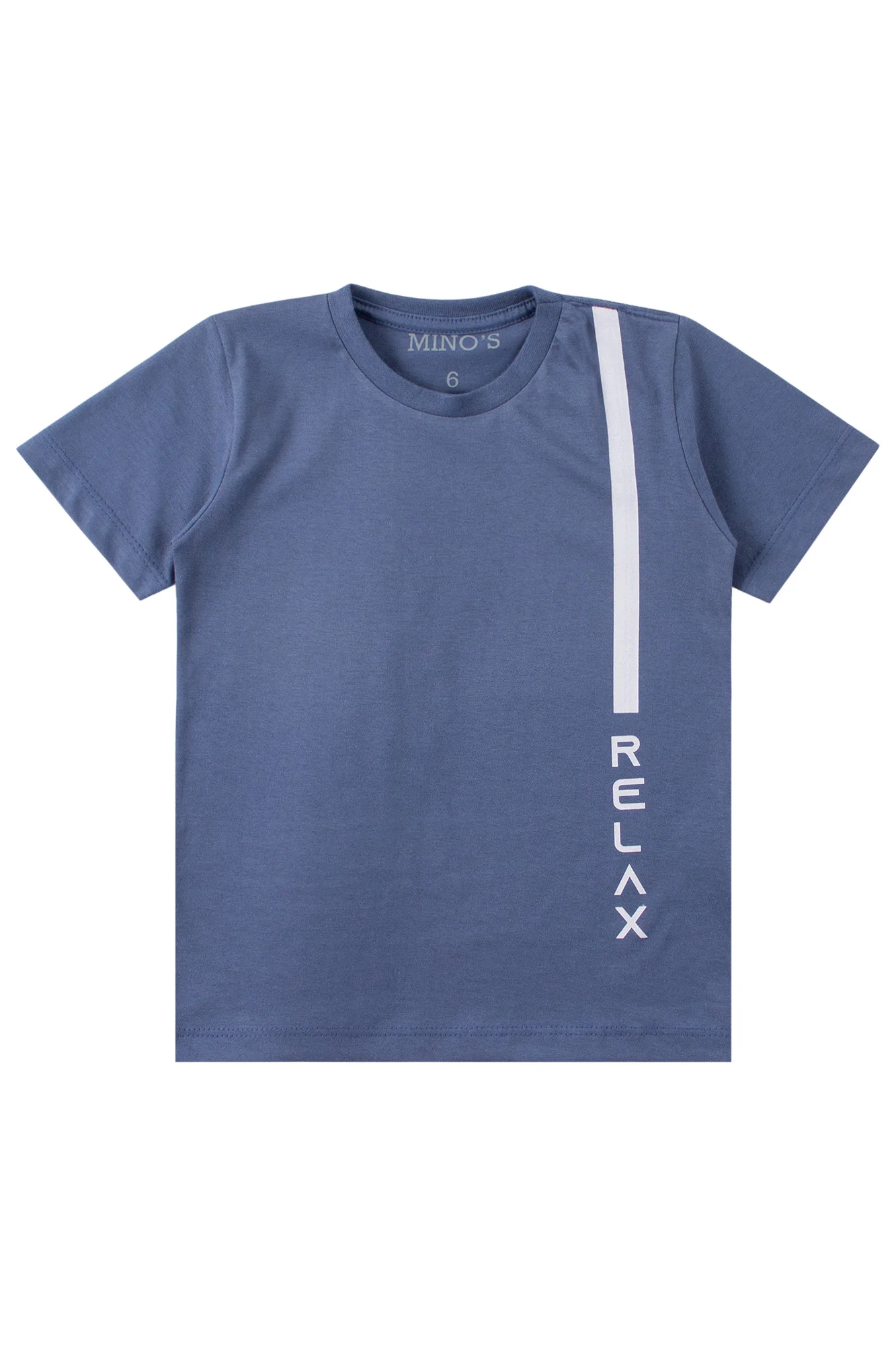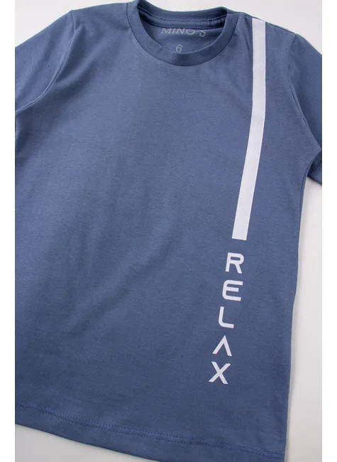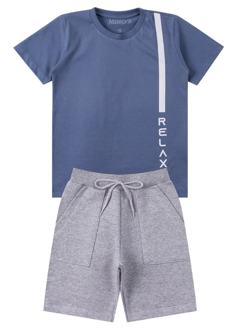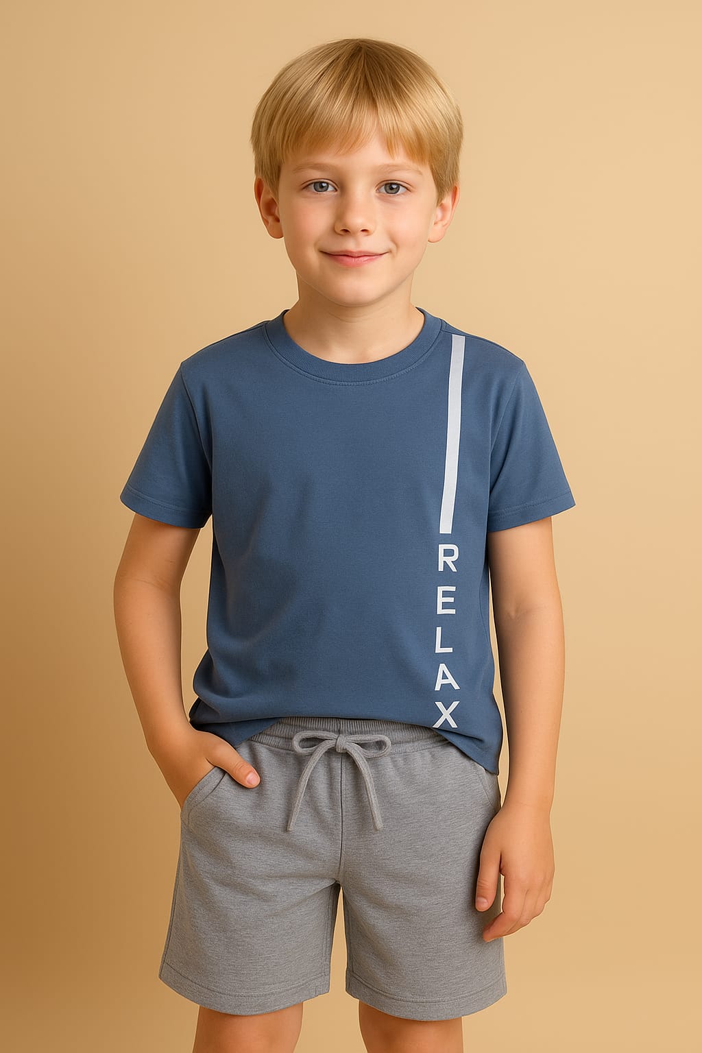 Conjunto azul de sudadera medio relajado para niño , compuesto por dos piezas. Camiseta de punto medio (100 % algodón), cuello redondo y estampado frontal. Bermudas de sudadera (75 % algodón, 25 % poliéster), cinturilla elástica acanalada y cordón decorativo frontal, bolsillos frontales funcionales.