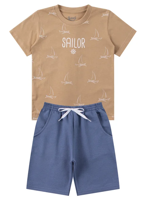 Conjunto de jersey marinero beige para niño , compuesto por dos piezas. Camiseta de jersey (100 % algodón), cuello redondo y estampado frontal. Bermudas de sudadera (75 % algodón, 25 % poliéster), cinturilla elástica y cordón decorativo frontal, bolsillos frontales funcionales.