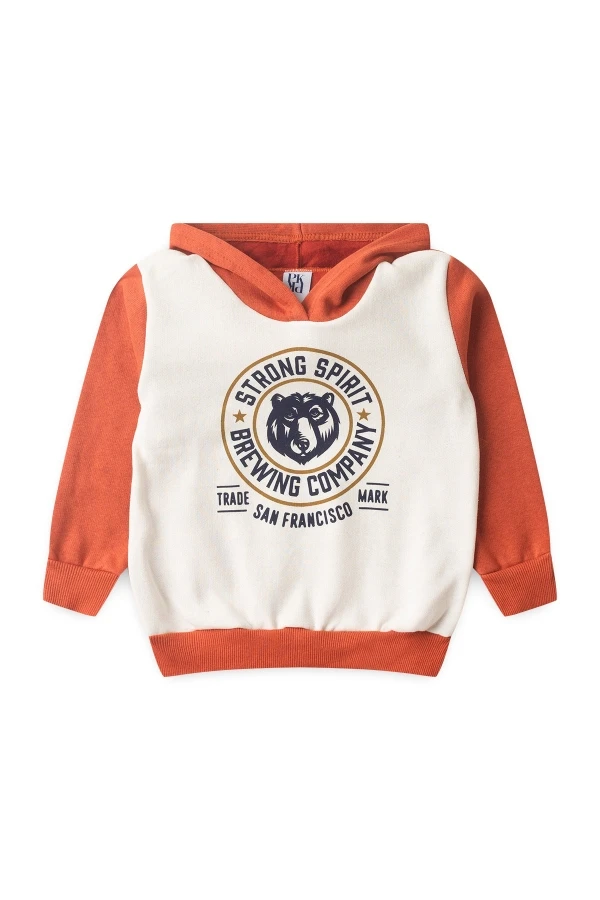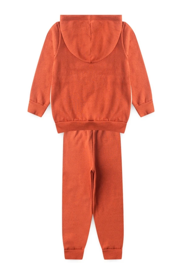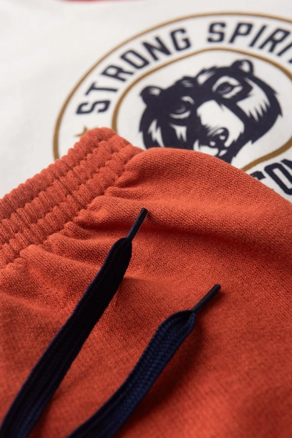 Conjunto moleton 50% algodón y 50% poliéster. Abrigo color blanco roto con estampado frontal y capucha súper abrigada, pantalón color óxido con cordones decorativos!