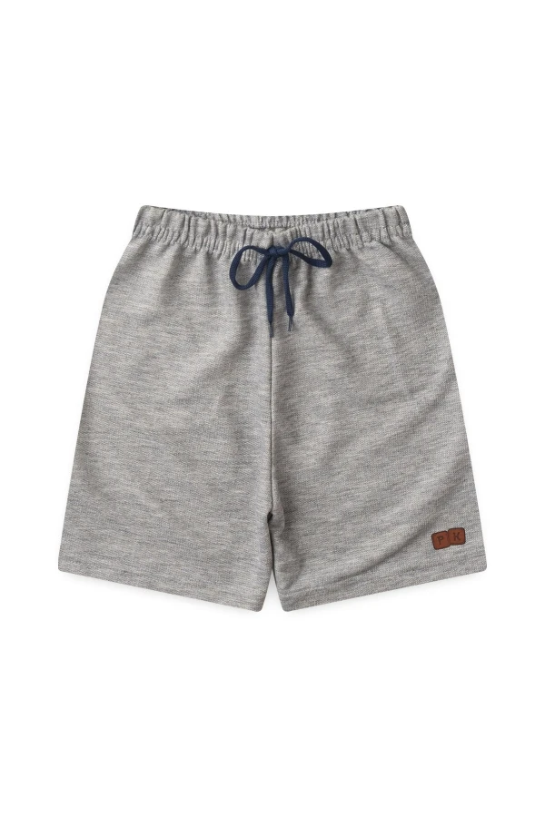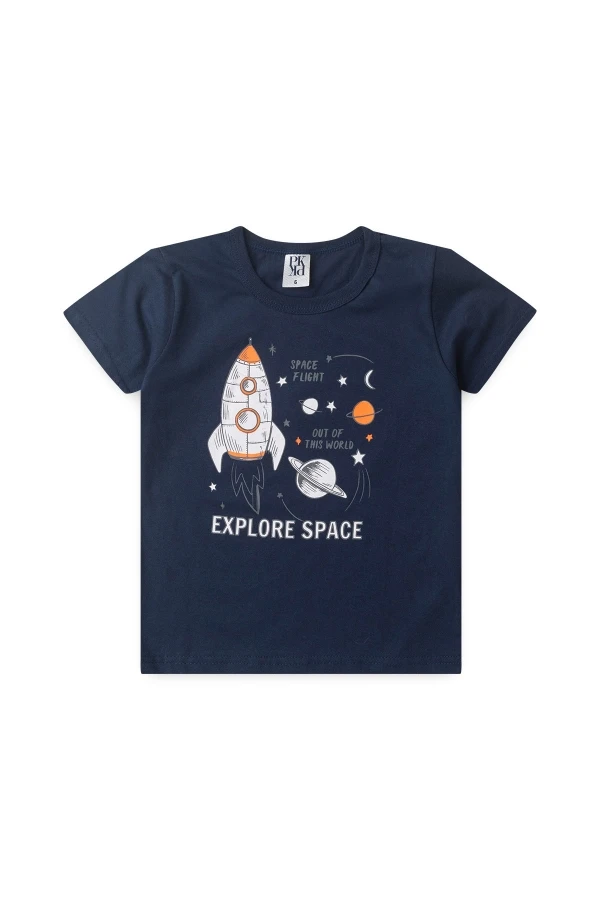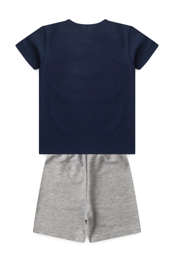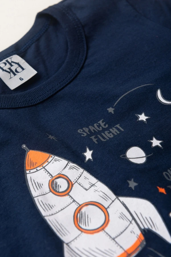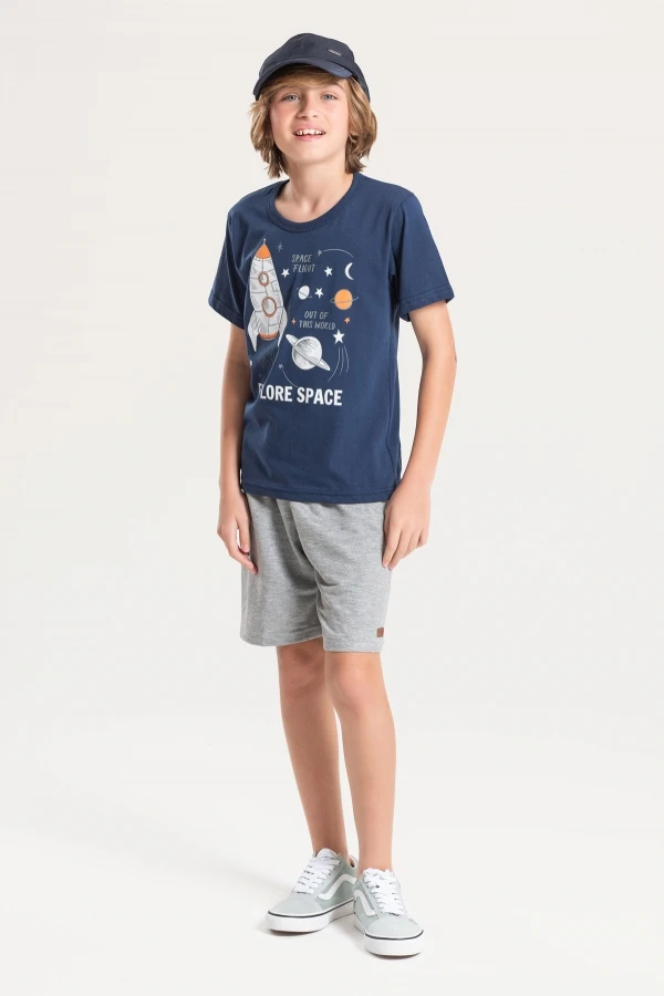 Conjunto de jersey y camiseta para hombre. Camiseta azul marino con estampado frontal y pantalón corto multicolor con cordones decorativos y parche PK. Todo pensado y producido con mucho amor y cuidado.