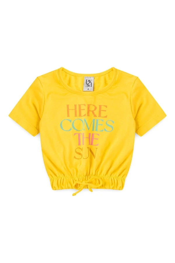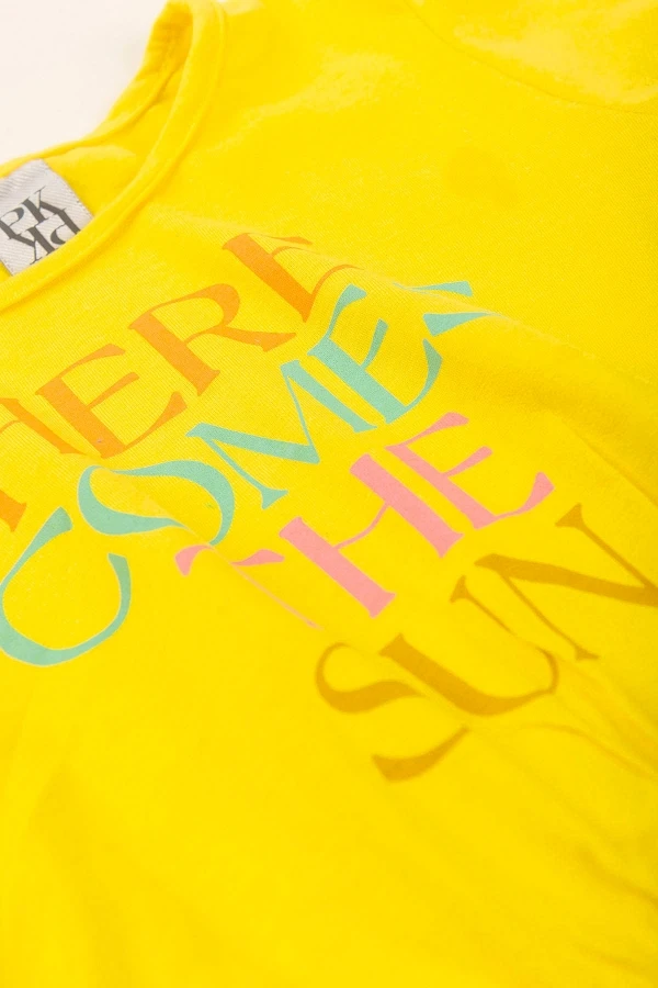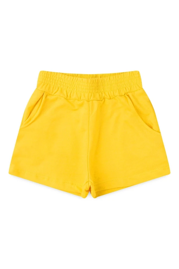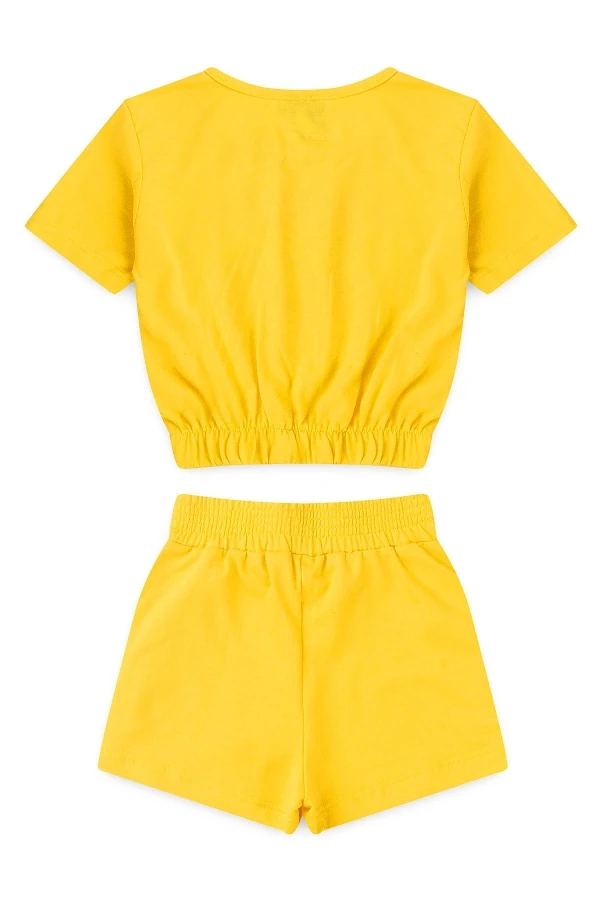Conjunto de mujer en jersey y sudadera. Top corto amarillo con estampado frontal, bajo elástico y cordones decorativos. Shorts amarillos con bolsillos, monísimos.