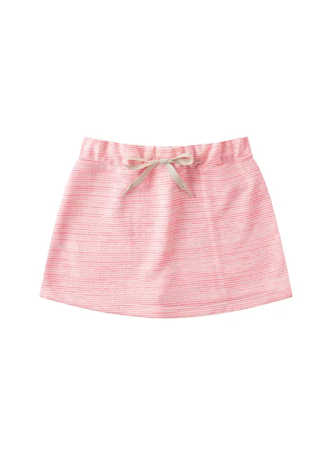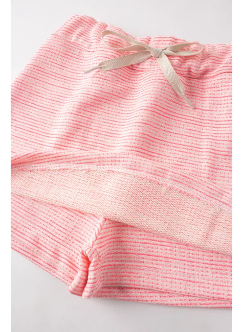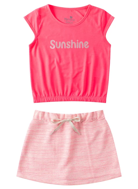 Conjunto de punto rosa neón Sunshine para niña , compuesto por dos piezas. Top de punto de poliéster (100 % poliéster), cuello redondo, estampado frontal con detalle de purpurina y bajo elástico. Falda corta de sudadera a rayas (50 % algodón, 50 % poliéster), cinturilla elástica y cordón decorativo frontal, solapa frontal.