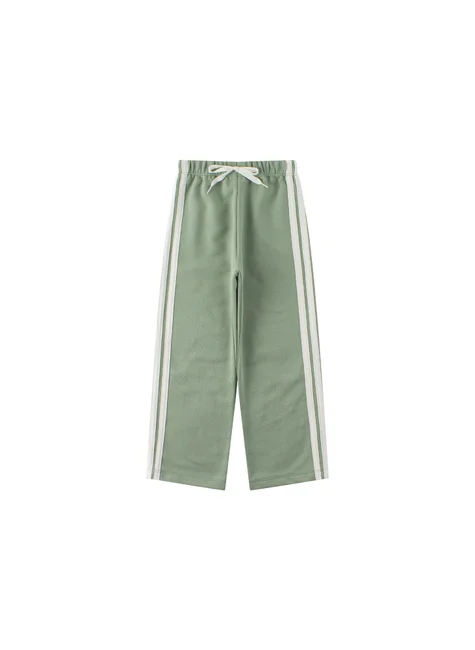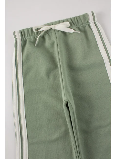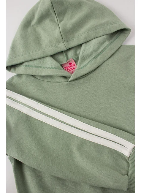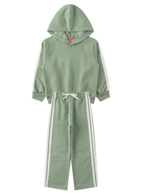 Conjunto de moleton de Felpa Elegante para Niña en Color Verde Malva, compuesto por dos piezas. confeccionado en tejido de moleton afelpado (75% algodón 25% poliéster), cuello redondo con capucha, mangas con detalles laterales en galón en color contraste, puños y bajo en canalé. Pantalón confeccionado en tejido afelpado (75% algodón 25% poliéster), cinturilla elástica con cordón decorativo en la parte delantera, detalles laterales trenzados en color en contraste.